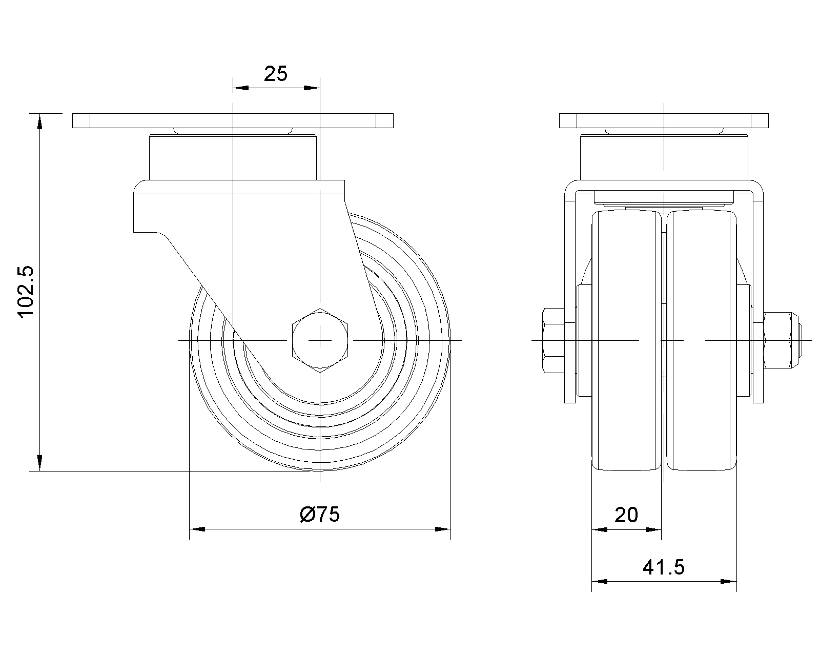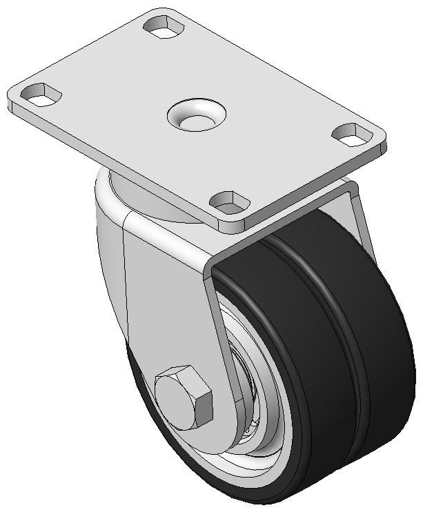 活动式脚轮,焊接钢板架 表面电镀,底板式安裝裝置,孔距75x45 铸铁制轮芯,高品质聚氨酯轮面,铣黑色 轮子轴承—特制的精密滾珠,降低运转阻力 ZQPU双轮,符合人体工学,更容易启动及转动 |