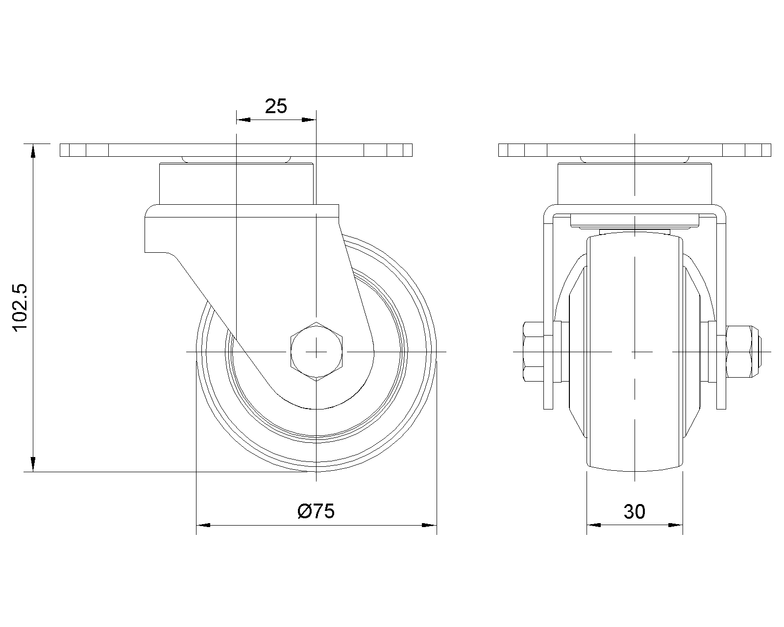 活动式脚轮,焊接钢板架,表面电镀 底板式安装装置,孔距80x60 铸铁制轮芯,高品质聚安酯轮面,铣灰色 轮子轴承—精密滚珠,配特制防缠绕轮盖 |