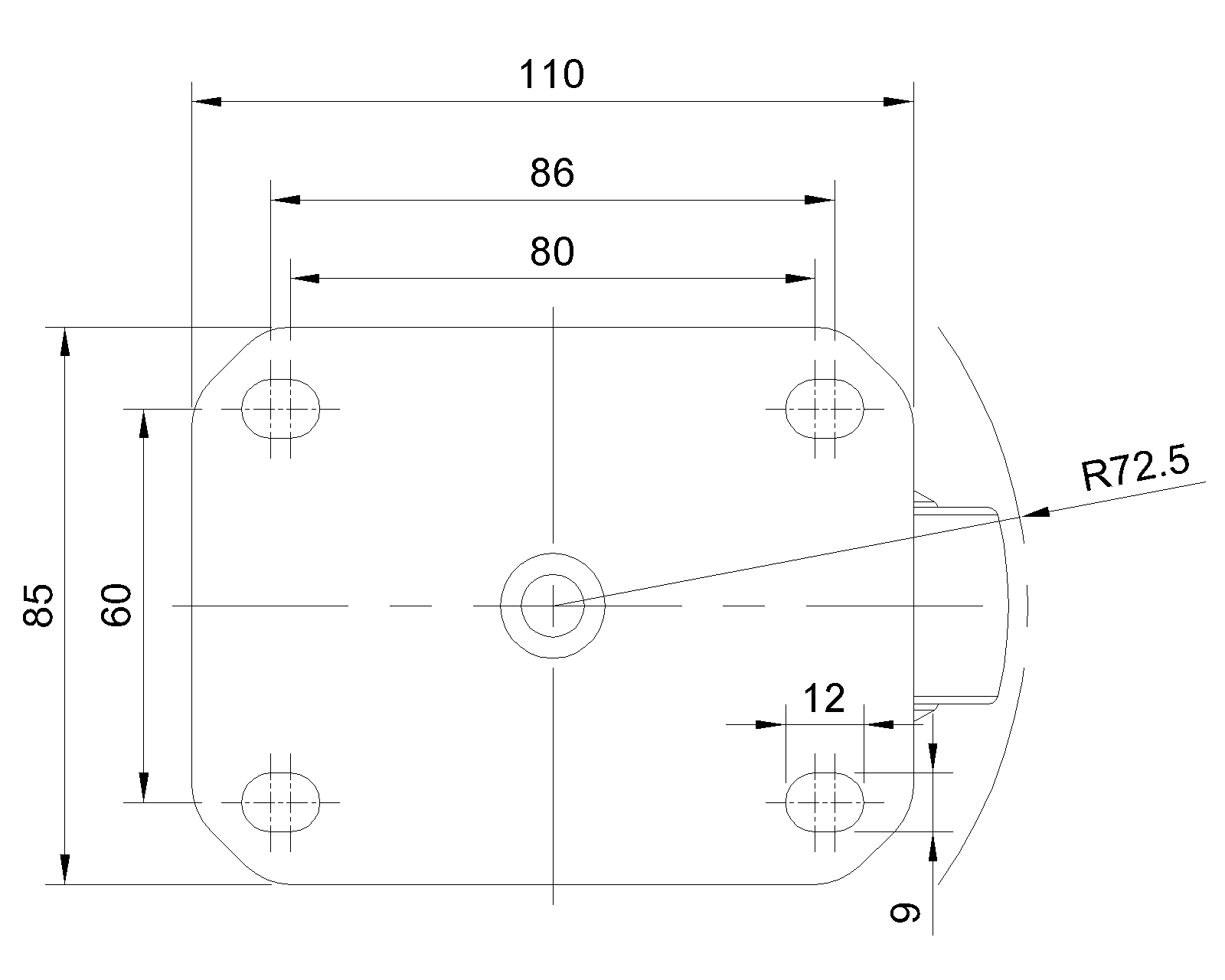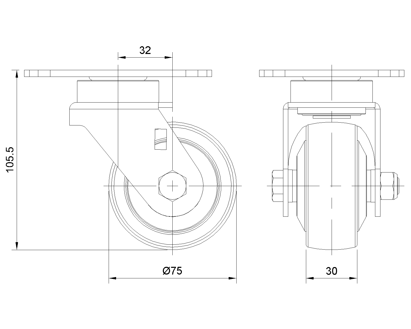 活动式脚轮,焊接钢板架,表面电镀 底板式安装装置,孔距80x60 铸铁制轮芯,高品质聚安酯轮面,铣灰色 轮子轴承—精密滚珠,配特制防缠绕轮盖 |
