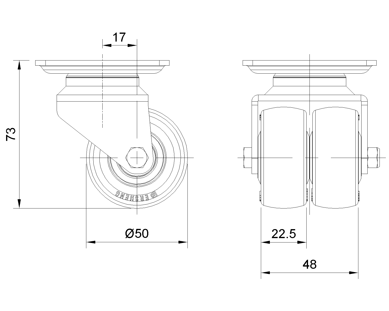 活动式脚轮,焊接钢板架,表面电镀 底板式安装装置,孔距55x55 耐冲击聚丙烯轮芯,热塑性弹性体(TPR)轮面 铣深灰色,轮子轴承—精密滚珠 |