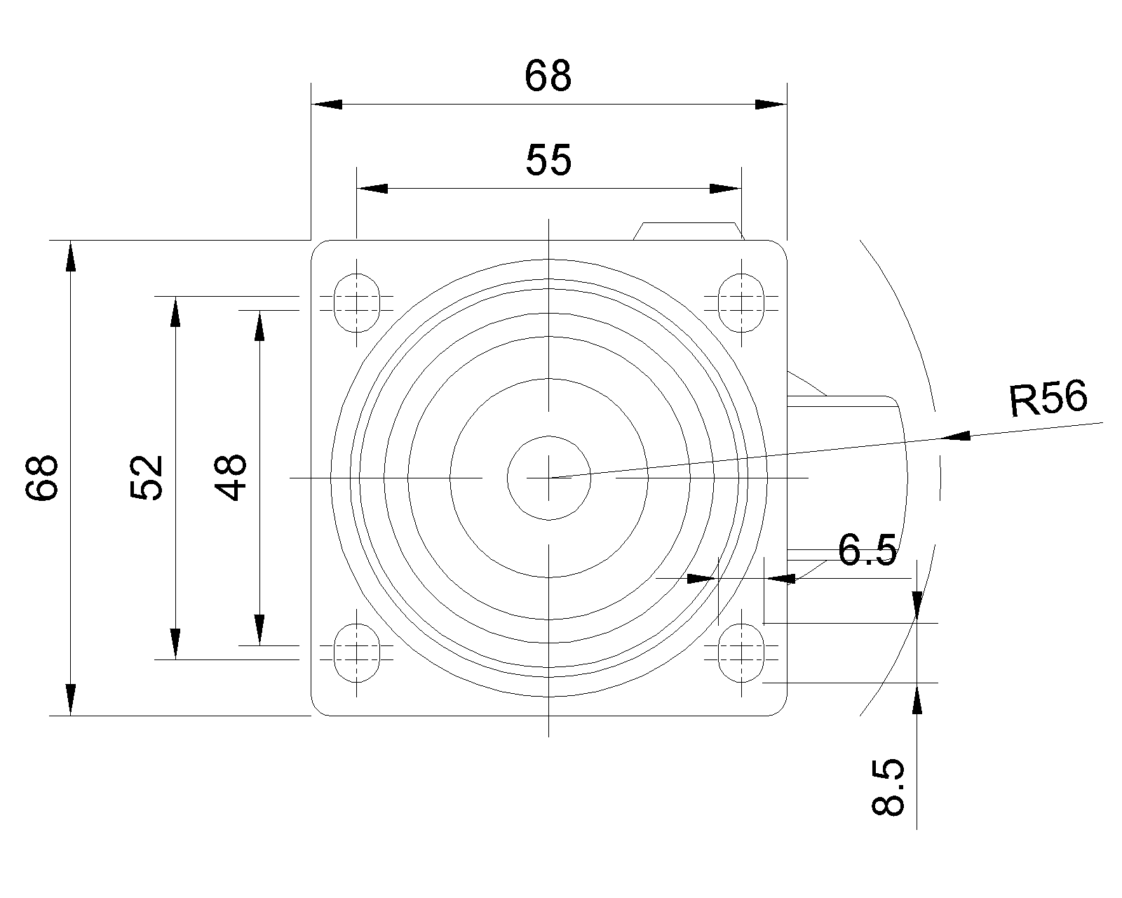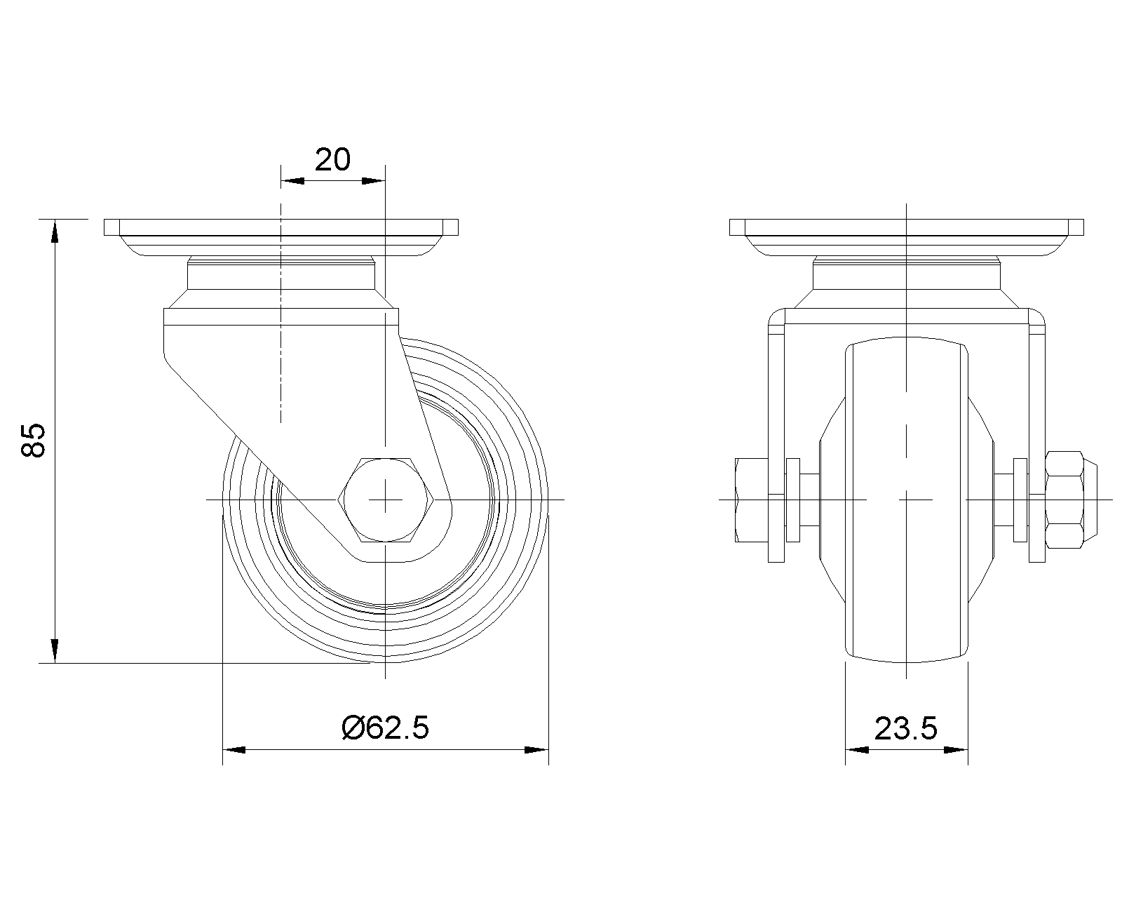 活动式脚轮,焊接钢板架,表面电镀 底板式安装装置,孔距55x52 耐冲击聚丙烯轮芯,热塑性弹性体(TPR)轮面 铣深灰色,轮子轴承—精密滚珠 |