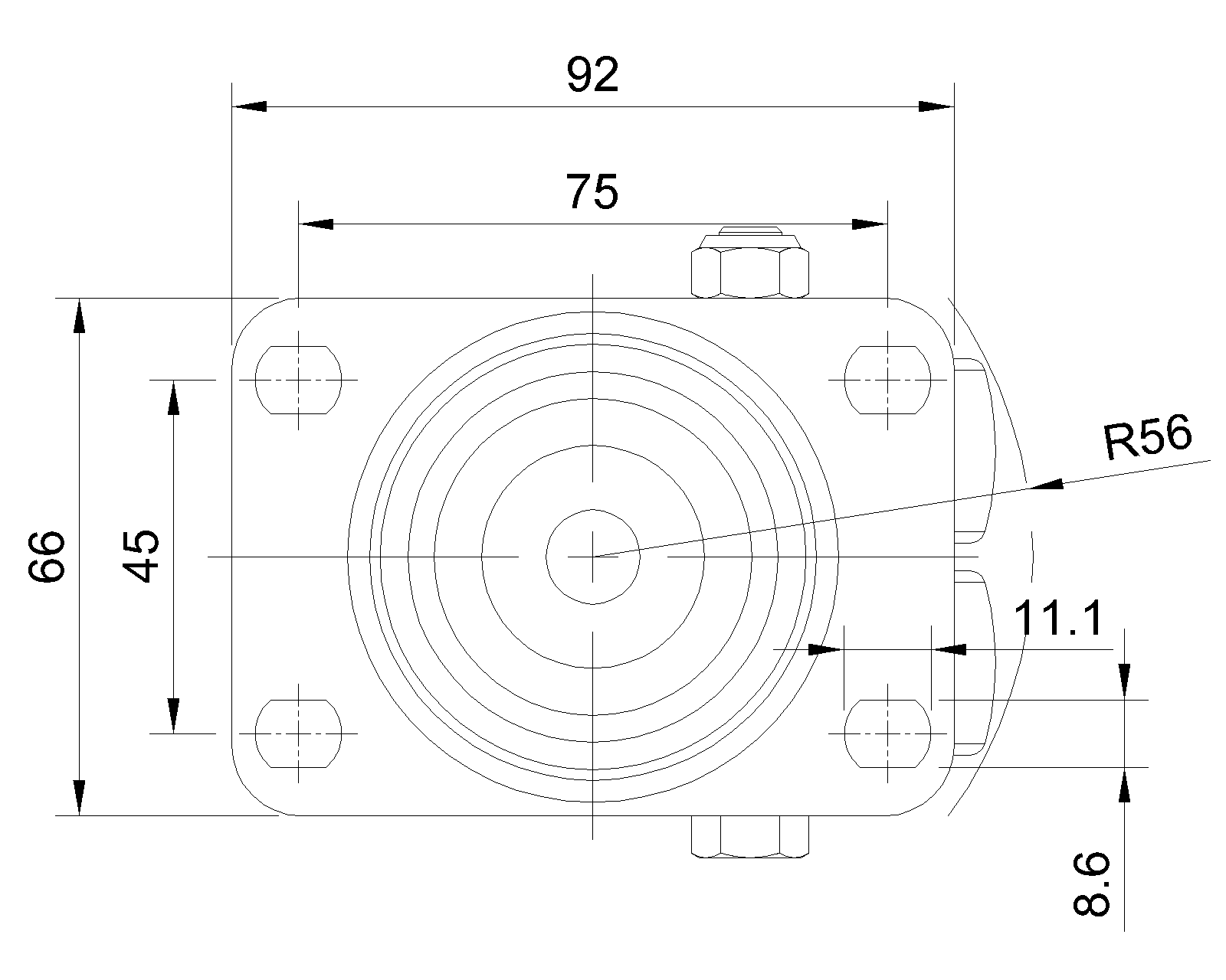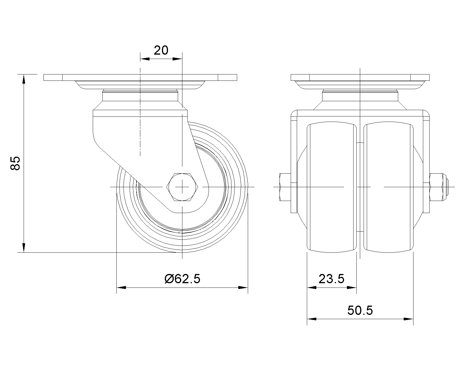 活动式脚轮,焊接钢板架,表面电镀 底板式安装装置,孔距75X45 耐冲击聚丙烯轮芯,热塑性弹性体(TPR)轮面 铣深灰色,轮子轴承—精密滚珠 |