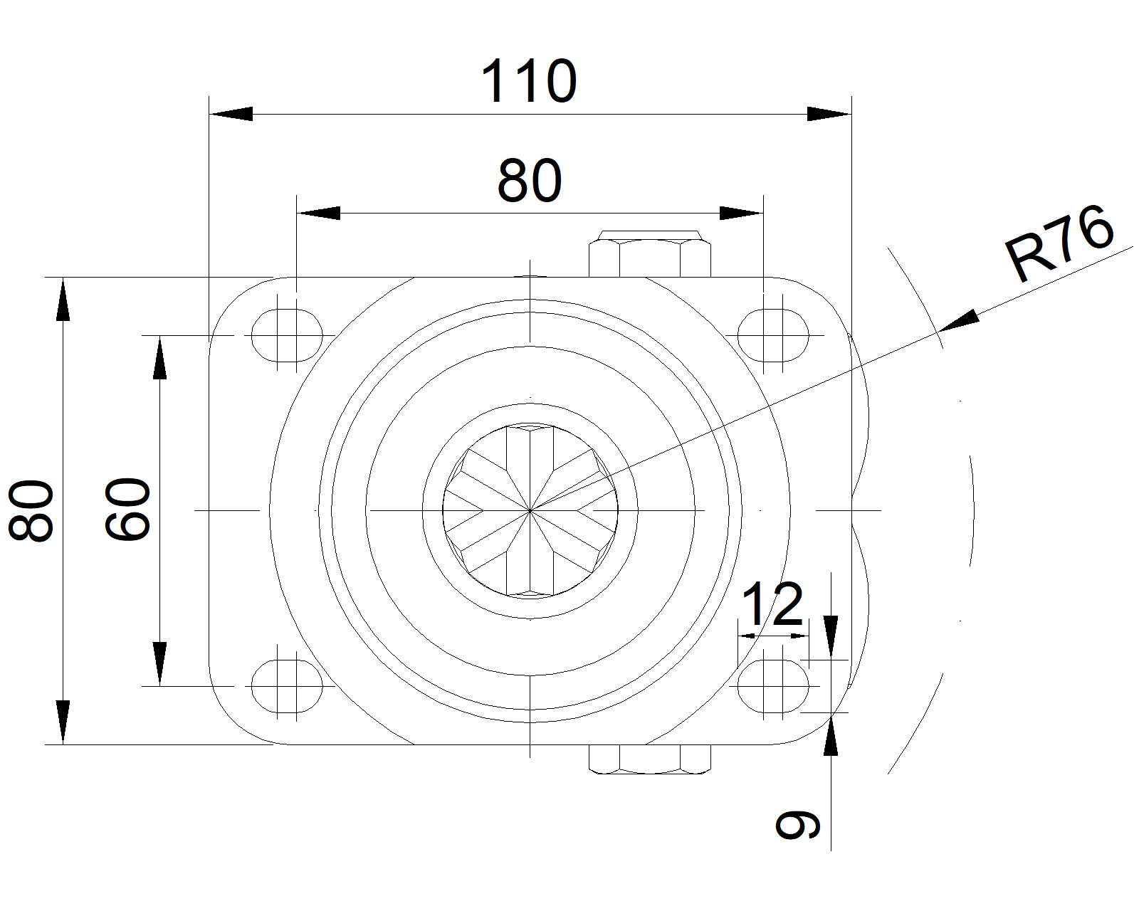 底板规格 110 x 80mm 底板孔距 80 x 60mm 底板孔径 12 x 9mm 偏心距 20.5mm 旋转干涉 152mm 总高 109mm 旋转半径 76mm 硬度 92±5° Shore A 荷重(动态) 300kgs |