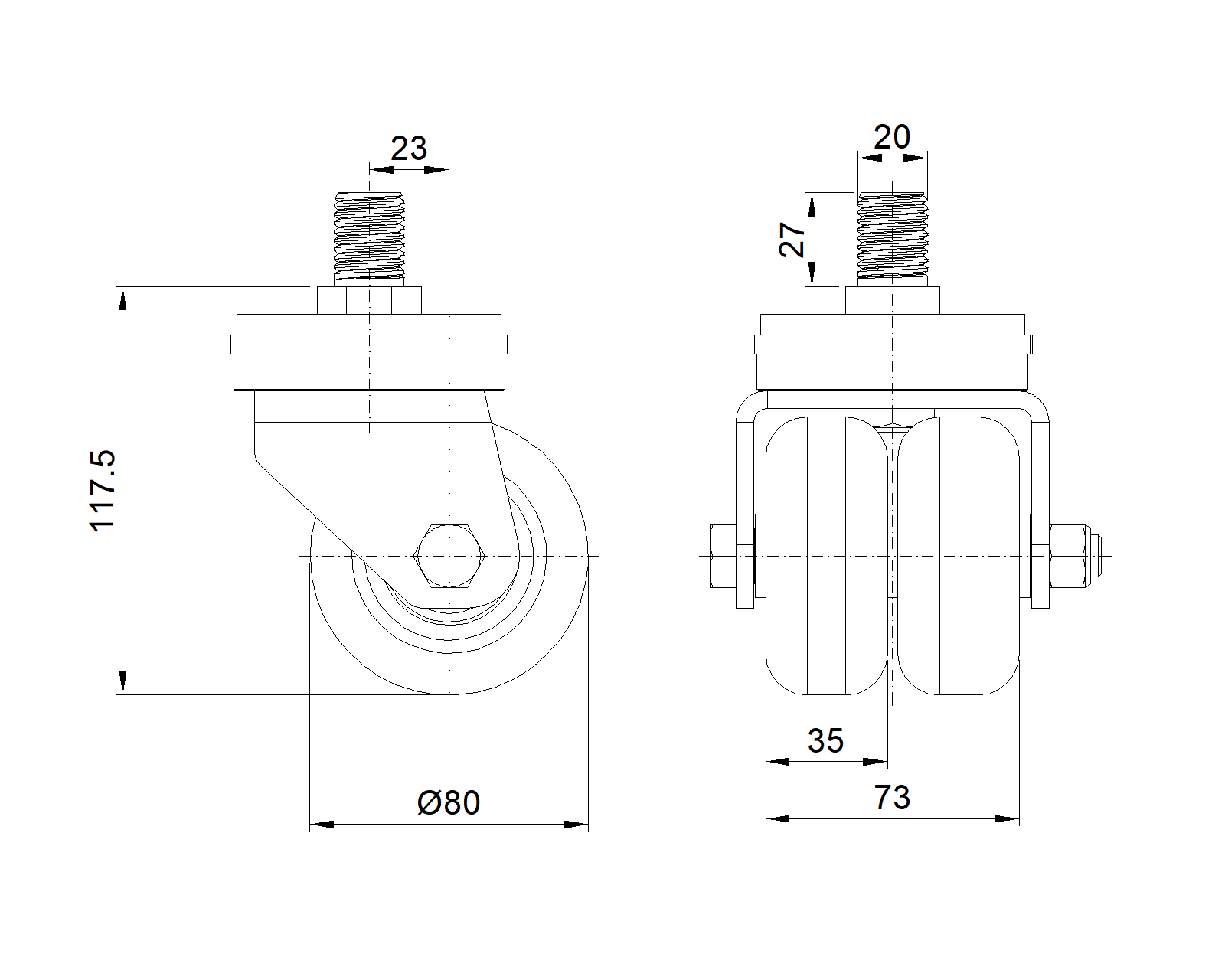 Swivel Caster, M20x27 thread, Fork reinforced with High-quality Impact Resistance Polypropylene. Rustproof, Corrosion resistant, Attractive appearance, Economical, and Reinforced. High-quality Impact Resistance Polypropylene Wheel Center,High-Quality Thermoplastic Rubber (TPR) tread. Brown, Bearing—Ball Bearing. |