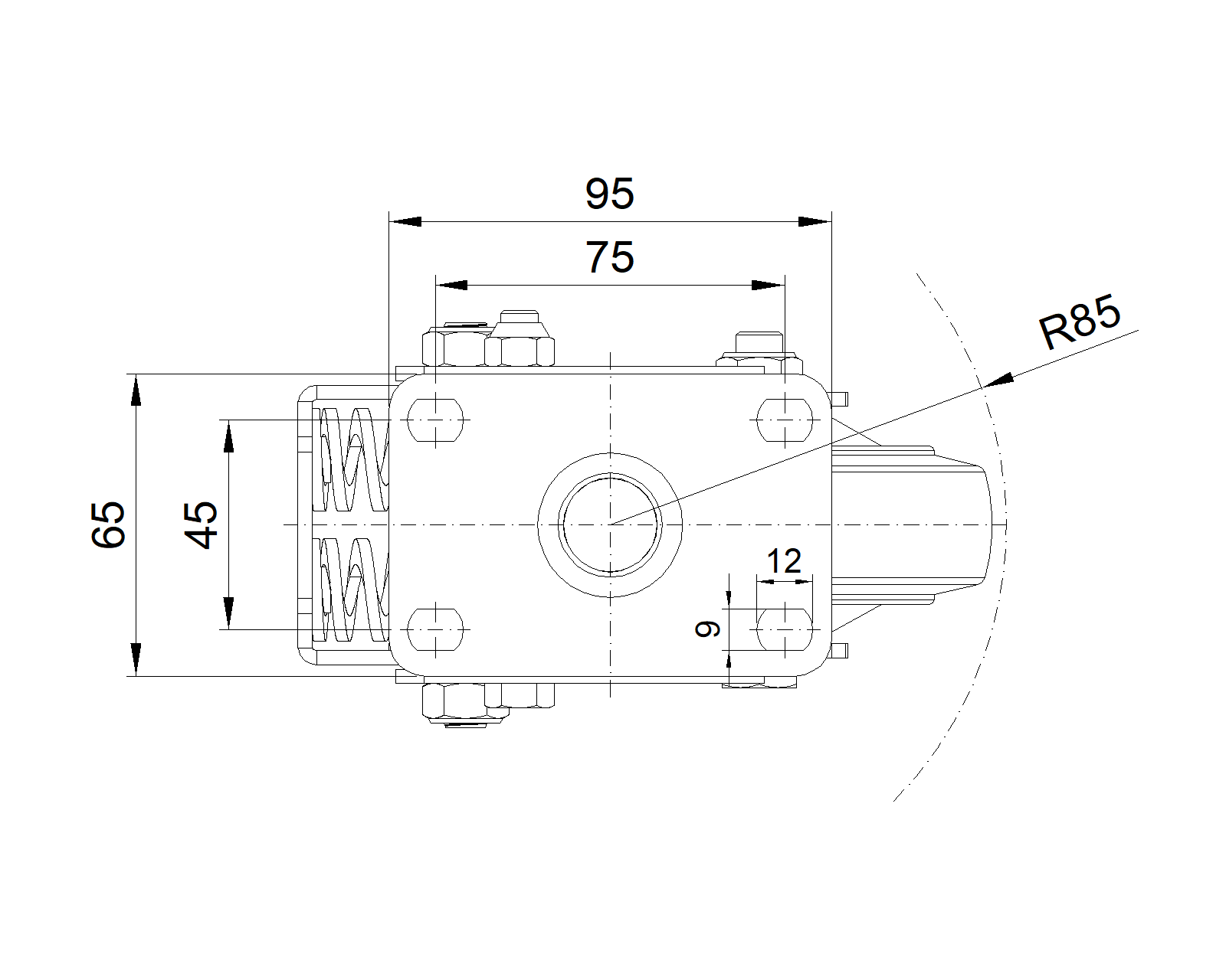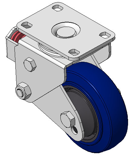Spring-loaded Caster with Welded Caster Fork Zine-Plated, Mounting Type - Top Plate, 75x45 Bolt Hole Spacing Cast Iron Wheel Center with High Quality Polyurethane tread, black-blue Bearing—Ball Bearing |