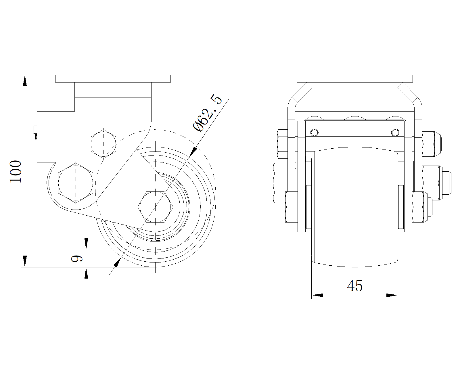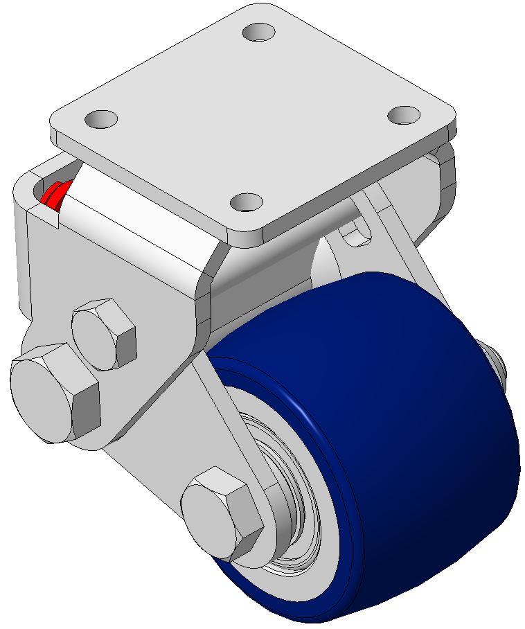 Bề mặt mạ kẽm, lắp tấm đế, khoảng cách lỗ 42,5x42,5 Lõi bánh xe bằng gang, gai bánh xe bằng polyurethane chất lượng cao Vòng bi bánh xe màu xanh lam, bi chính xác. |