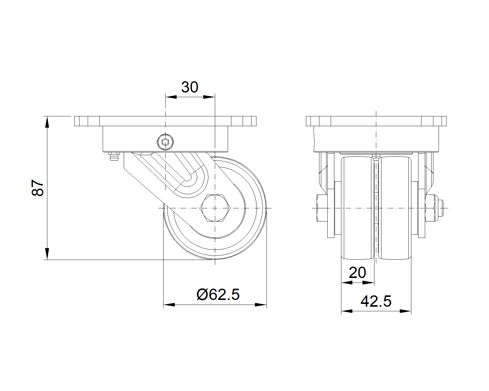 | Chống tĩnh điện ZQPU Bánh xe (phay đen) Đường kính bánh xe × Chiều rộng bánh xe 62.5 x 20(41.5)mm |