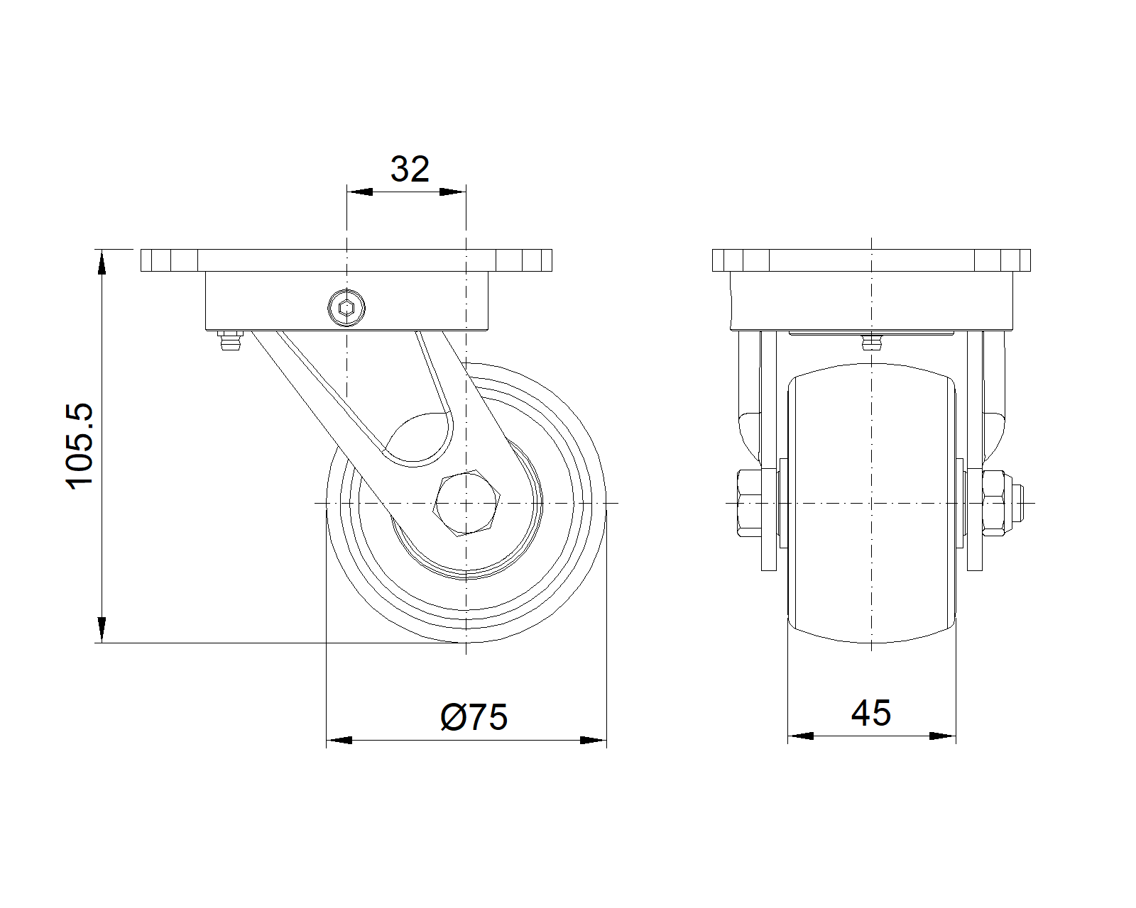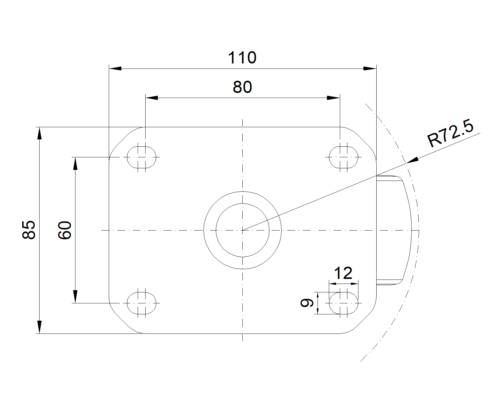 Quy cách tấm lắp 110 x 85mm khoảng cách các lỗ trên tấm nền 80 x 60mm Khoảng cách các lỗ lắp 12 x 9mm Độ lệch tâm 32mm Sự can thiệp quay 145mm Tổng chiều cao 105.5mm Bán kính xoay 72.5mm Độ cứng 87±5° Shore A Tải trọng (động) 250kgs |