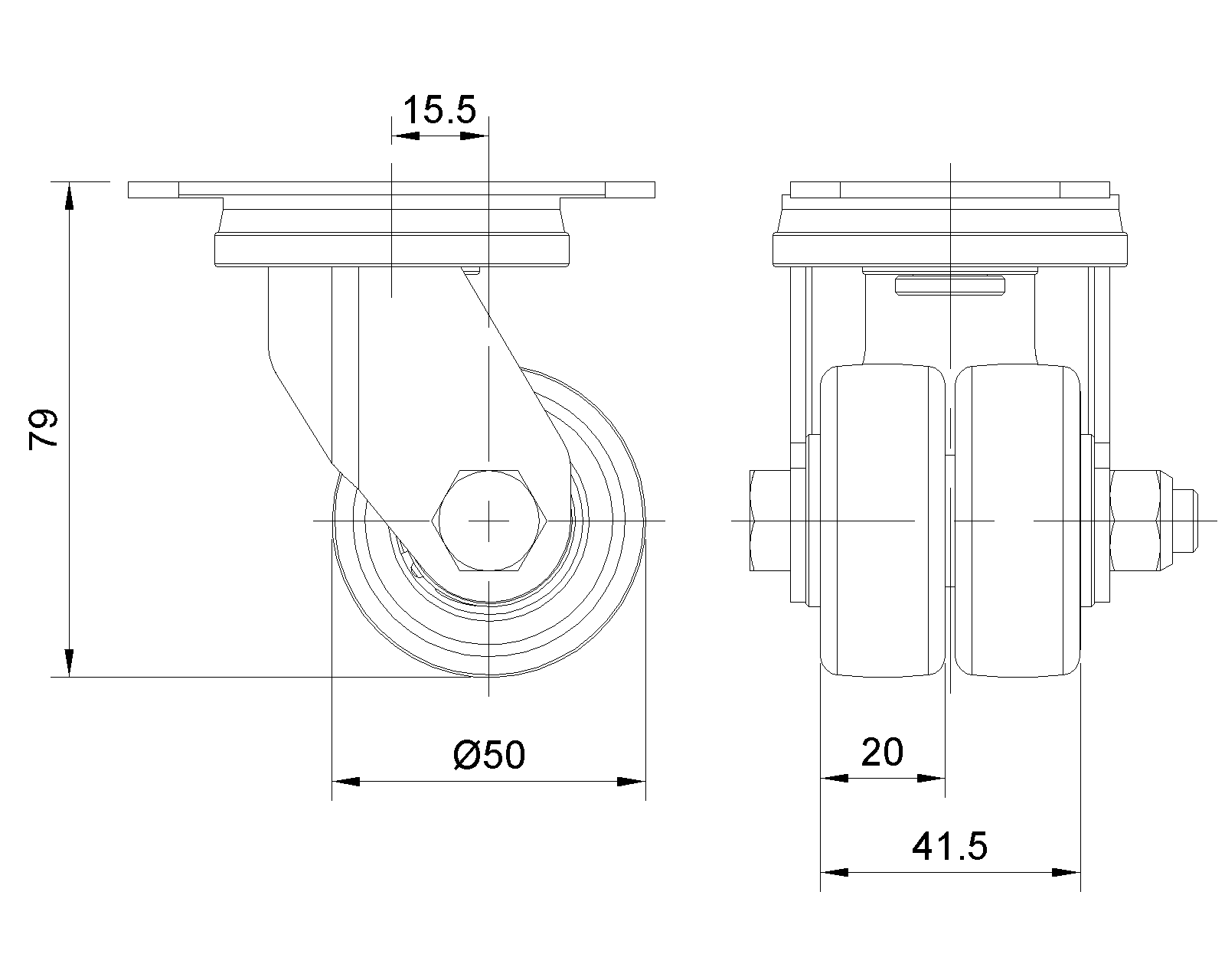 | Chống tĩnh điện ZQPU Bánh xe (phay đen) Đường kính bánh xe × Chiều rộng bánh xe 50 x 20(41.5)mm |