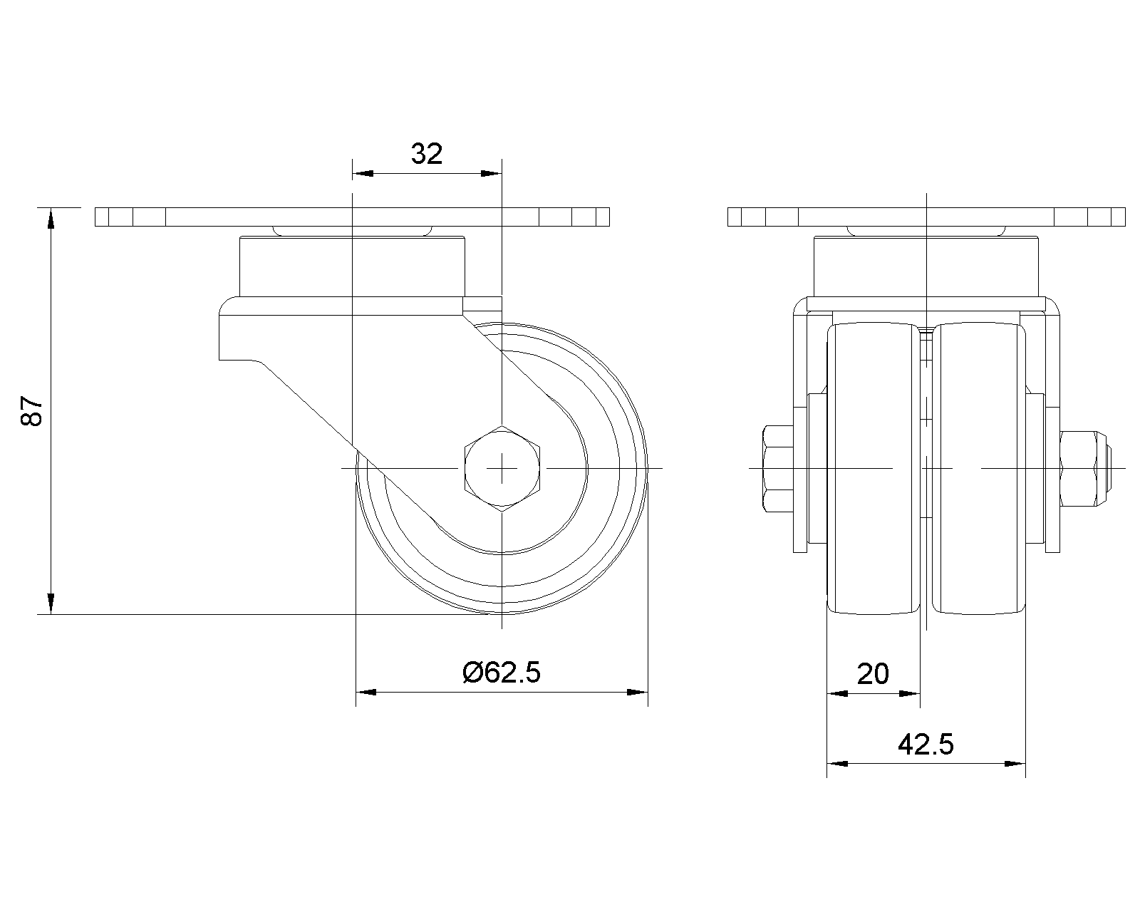 Bánh xe xoay với khung thép hàn, hoàn thiện mạ kẽm Lắp đế, khoảng cách lỗ 80x60 Lõi bánh xe bằng gang, gai polyurethane chất lượng cao, phay màu xanh Vòng bi bánh xe—vòng bi chính xác đặc biệt giúp giảm lực cản khi vận hành Bánh xe đôi ZQPU, được thiết kế công thái học giúp khởi động và quay đầu dễ dàng hơn |