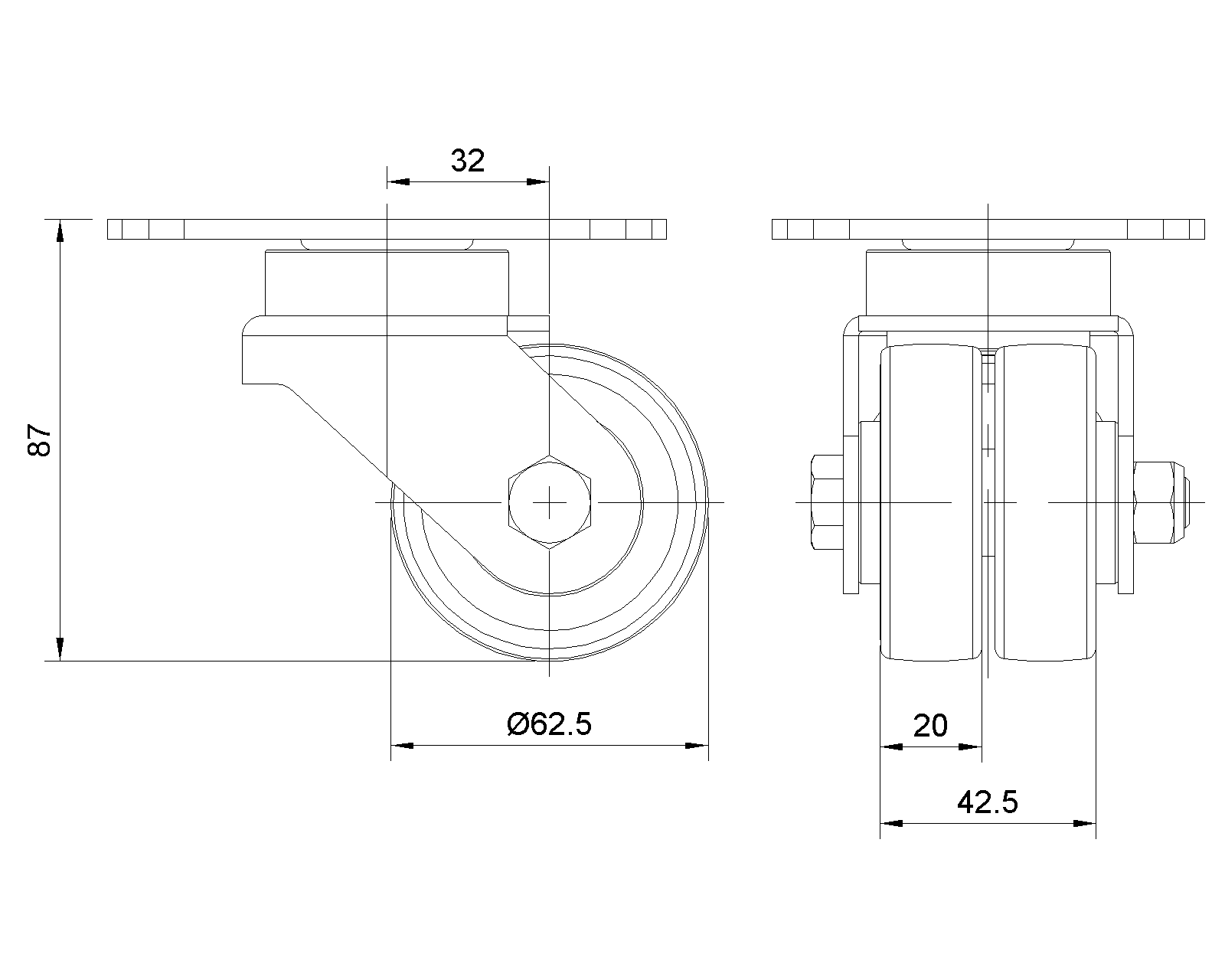 | Chống tĩnh điện ZQPU Bánh xe (phay đen) Đường kính bánh xe × Chiều rộng bánh xe 62.5 x 20(41.5)mm |