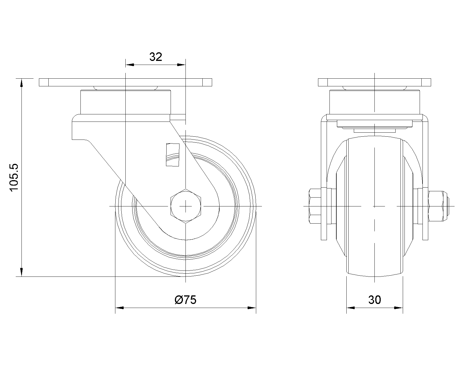 Bánh xe xoay với khung thép hàn và lớp mạ điện Lắp đế, khoảng cách lỗ 75x45 Lõi gang với gai polyurethane chất lượng cao, màu xám phay Vòng bi bánh xe—vòng bi chính xác với nắp chống quấn đặc biệt |