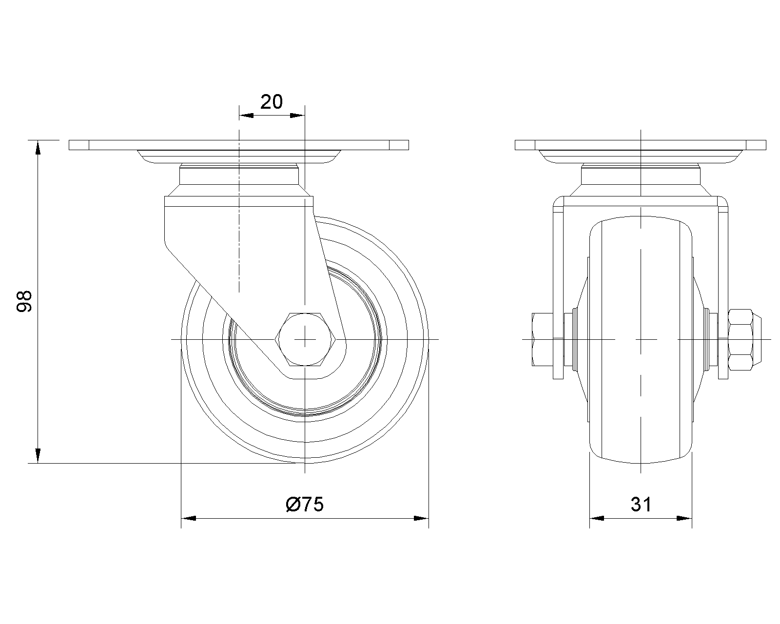 Bánh xe xoay, khung thép hàn Hoàn thiện mạ điện, lắp đế, khoảng cách lỗ 80x60 Lõi bánh xe bằng polypropylene chống va đập, gai lốp bằng nhựa nhiệt dẻo đàn hồi (TPR) Vòng bi bánh xe màu xám đậm được phay—vòng bi chính xác |