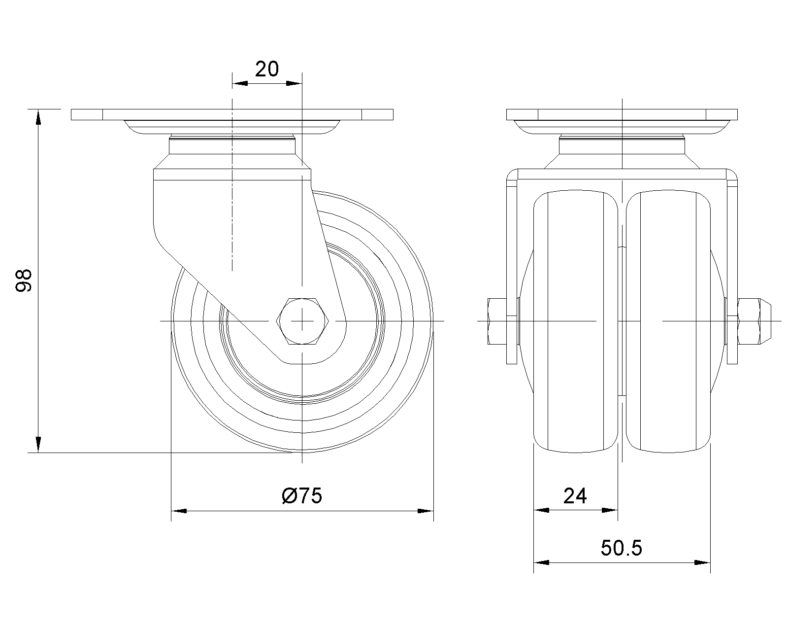 Bánh xe xoay, khung thép hàn, lớp mạ điện Lắp đế, khoảng cách lỗ 75x45 Lõi bánh xe bằng polypropylene chống va đập, gai lốp bằng nhựa nhiệt dẻo đàn hồi (TPR) Vòng bi bánh xe màu xám đậm được phay—vòng bi chính xác |