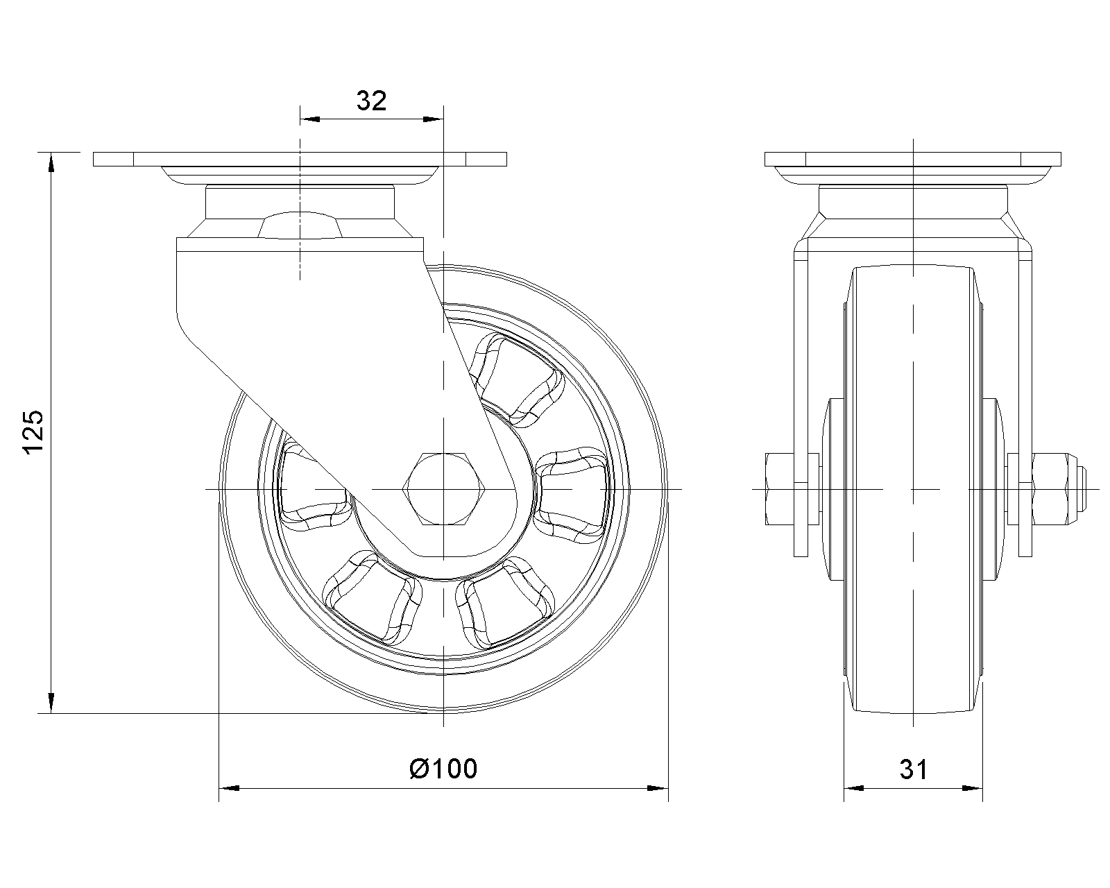 Bánh xe xoay, khung thép hàn, lớp mạ điện Lắp đế, khoảng cách lỗ 75x45 Lõi bánh xe bằng polypropylene gia cố chống va đập, gai lốp bằng nhựa nhiệt dẻo đàn hồi (TPR) Vòng bi bánh xe màu xám đậm ánh ngọc trai được phay—vòng bi chính xác |