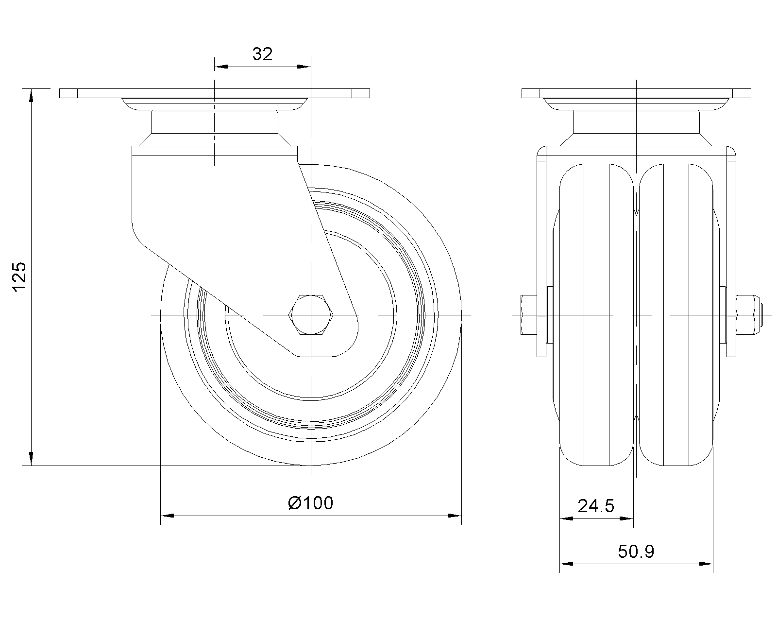 Bánh xe xoay, khung thép hàn, lớp mạ điện Lắp đế, khoảng cách lỗ 80x60 Lõi bánh xe bằng polypropylene chống va đập, gai lốp bằng nhựa nhiệt dẻo đàn hồi (TPR) Vòng bi bánh xe màu xám đậm được phay—vòng bi chính xác |