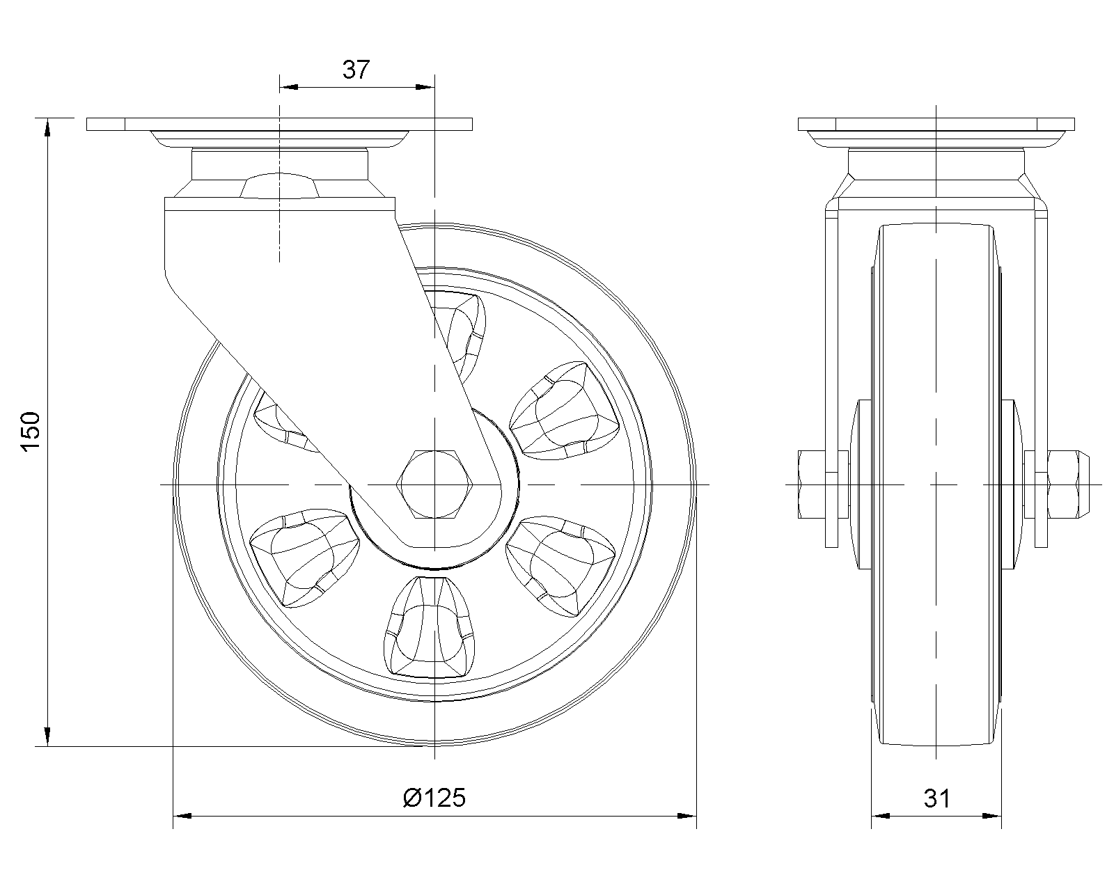 Bánh xe xoay, khung thép hàn, lớp mạ điện Lắp đế, khoảng cách lỗ 75x45 Lõi bánh xe bằng polypropylene gia cố chống va đập, gai lốp bằng nhựa nhiệt dẻo đàn hồi (TPR) Vòng bi bánh xe màu xám đậm được phay—vòng bi chính xác |