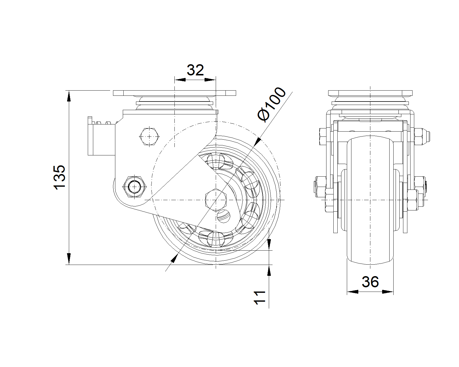 | Bánh xe W hiệu quả toàn diện (đen đậm xám), đường kính bánh xe × chiều rộng bánh xe là 100 x 36 mm. |