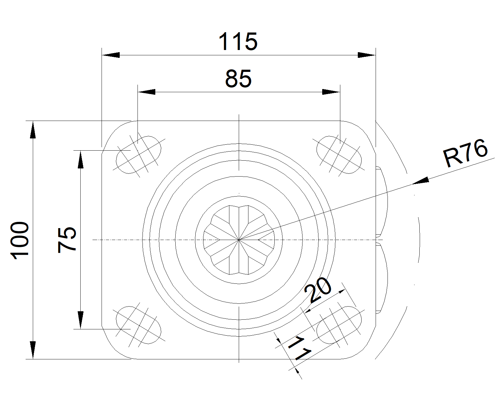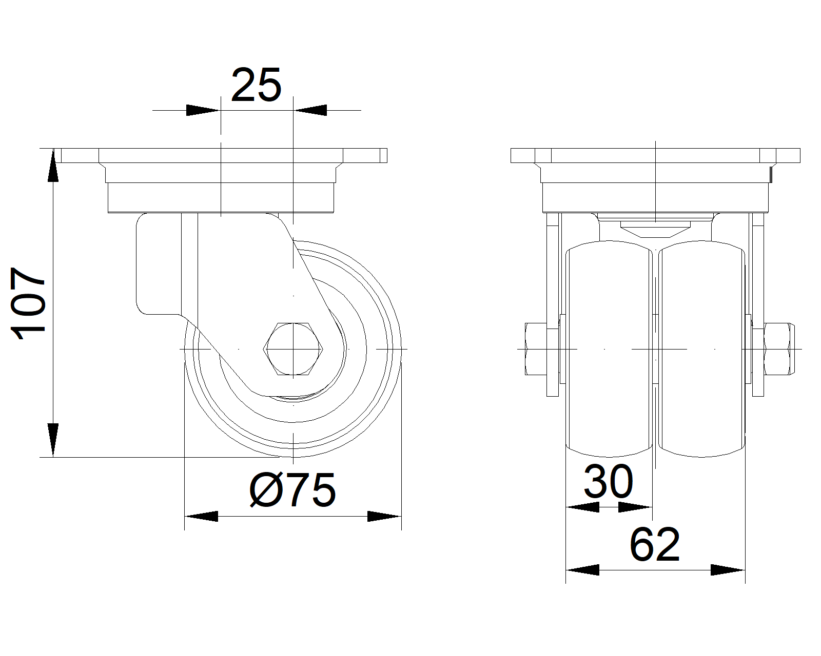 Phun kẽm bề mặt, lắp đặt tấm đế, khoảng cách lỗ 85 x 70 Lõi bánh xe bằng gang, bề mặt bánh xe bằng polyurethane chất lượng cao, phay màu cam Ổ trục bánh xe - bi chính xác |