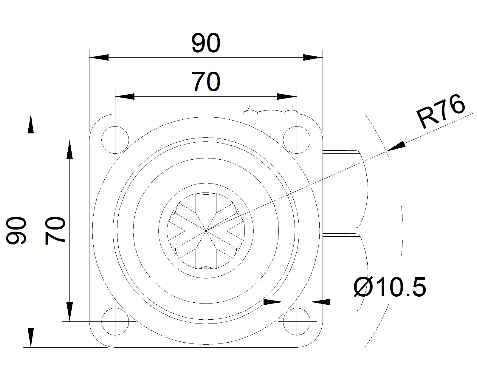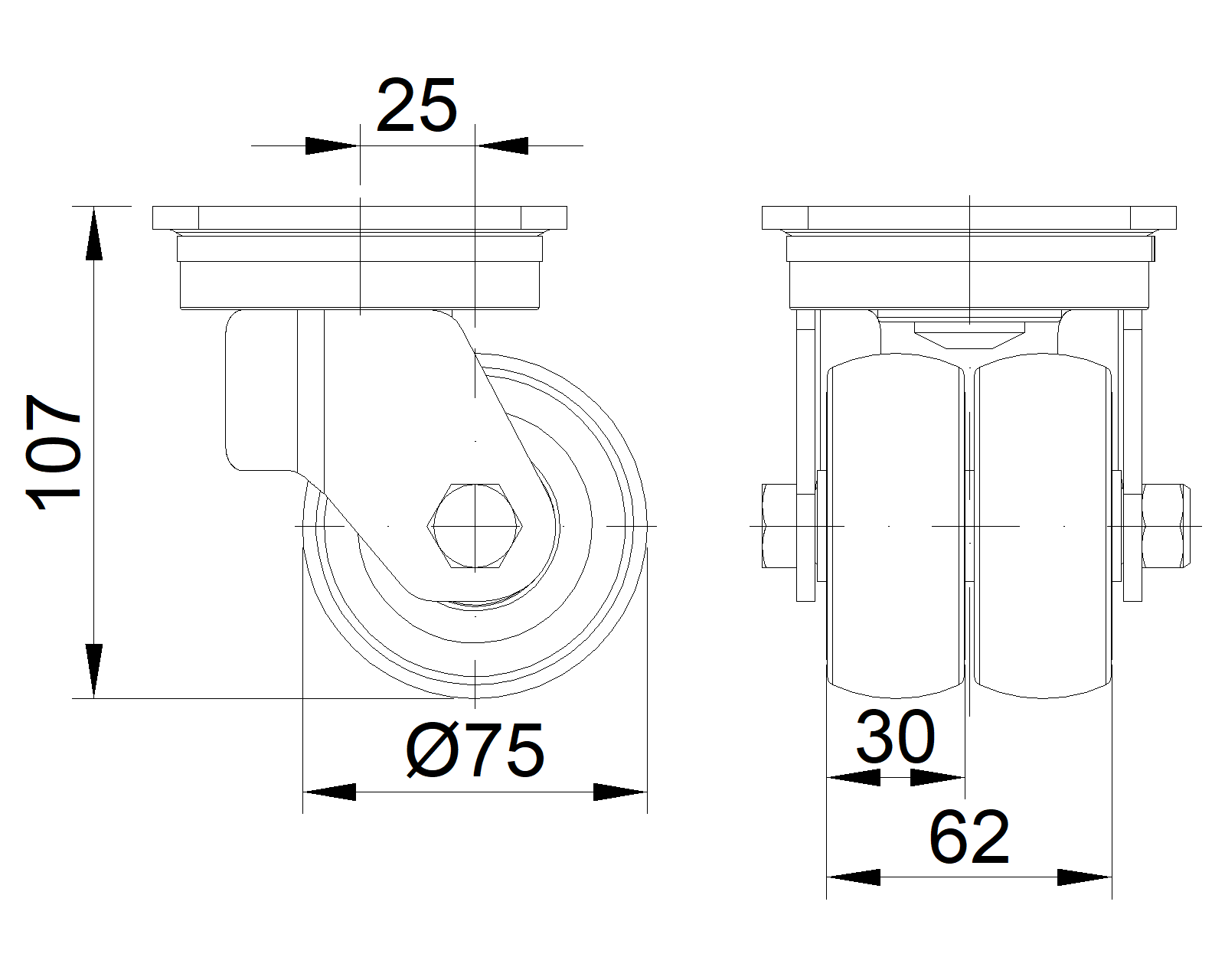Bề mặt phun kẽm, lắp đặt trên đế, khoảng cách lỗ 70 x 70 Lõi bánh xe bằng gang, bề mặt bánh xe bằng polyurethane chất lượng cao, phay đen Vòng bi bánh xe - bi chính xác, chống tĩnh điện |