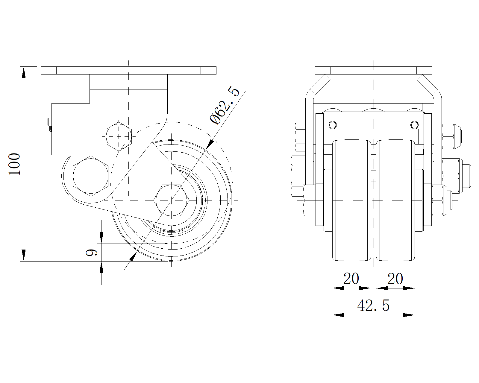 | Chống tĩnh điện ZQPU Bánh xe (phay đen) Đường kính bánh xe × Chiều rộng bánh xe 62.5 x 20(41.5)mm |