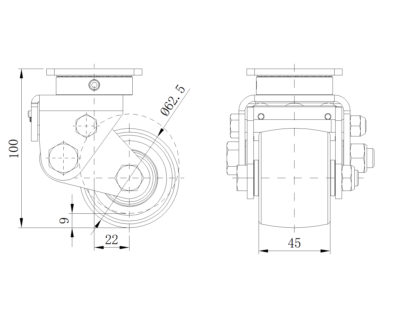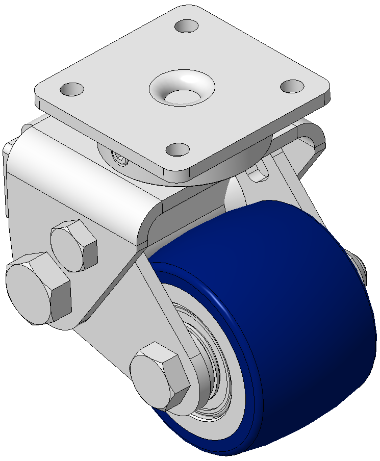 Hoàn thiện mạ kẽm, lắp đế, khoảng cách lỗ 42,5 x 42,5 Lõi gang với gai polyurethane chất lượng cao Hoàn thiện màu xanh, ổ trục bánh xe—ổ trục bi chính xác. |