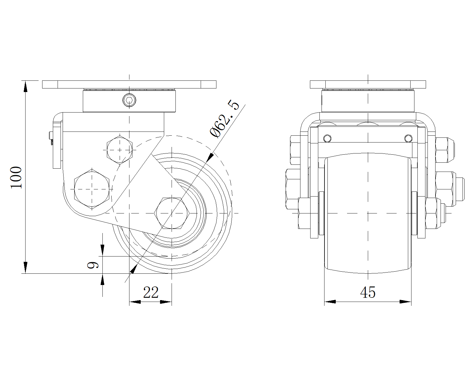 Hoàn thiện mạ kẽm, lắp đế, khoảng cách lỗ 73 x 44,5" Lõi gang với gai polyurethane chất lượng cao Hoàn thiện màu xanh, ổ trục bánh xe—ổ trục bi chính xác. |