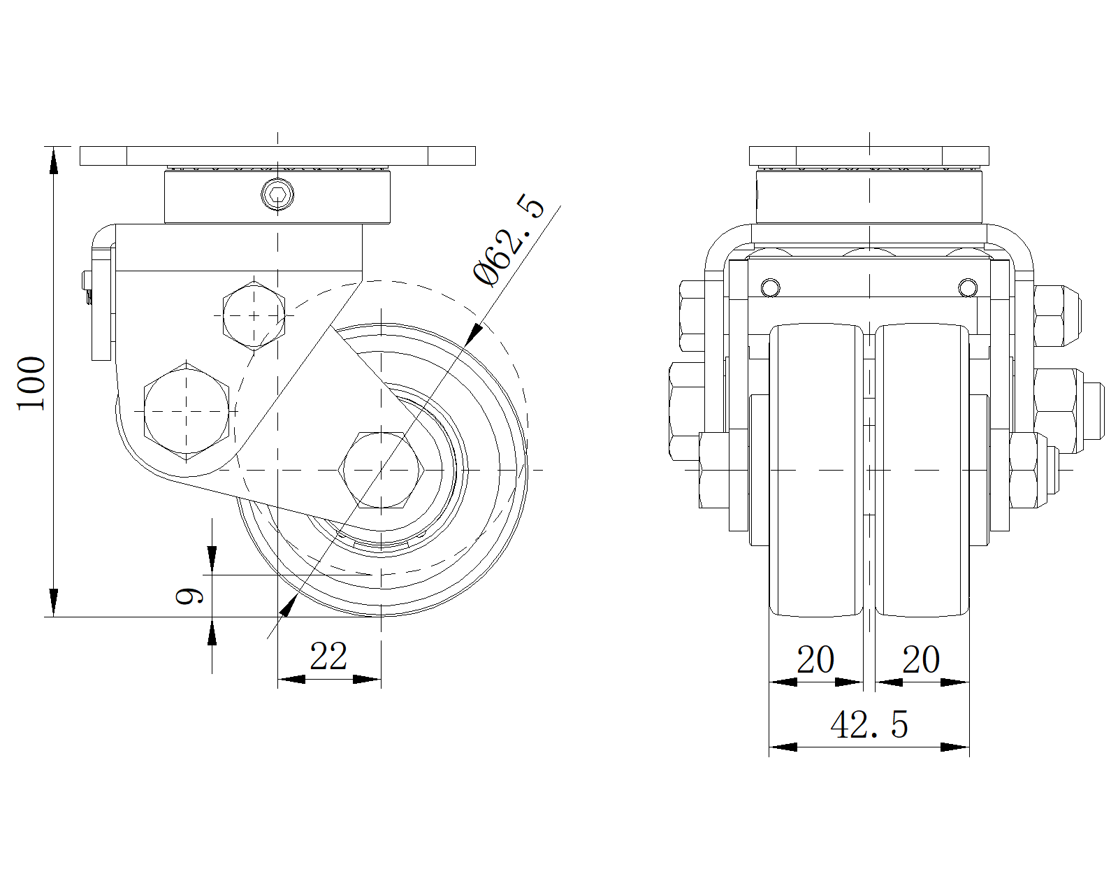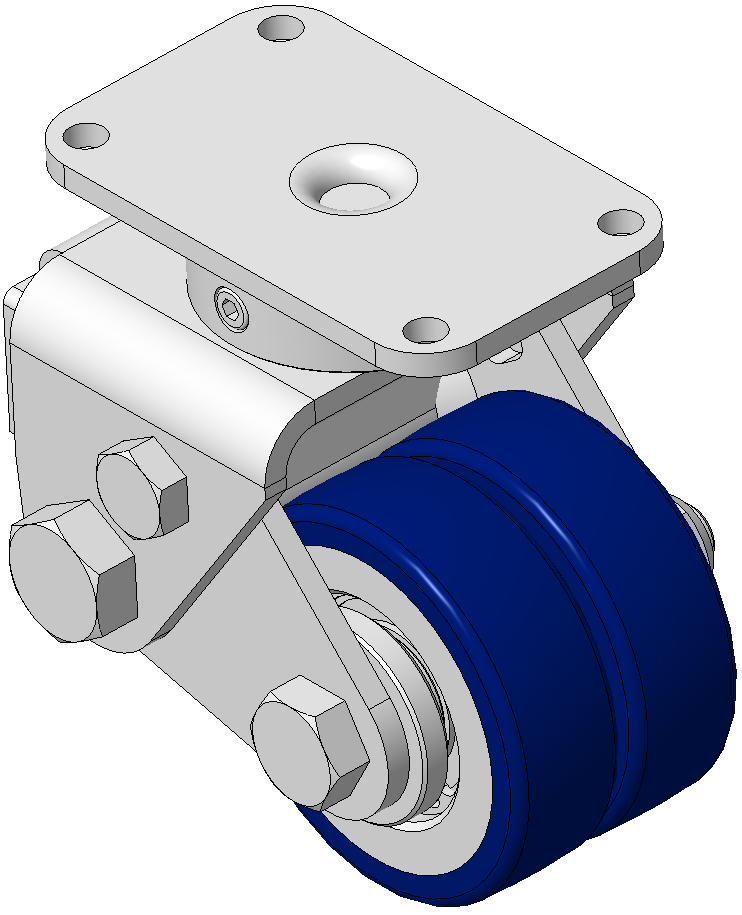 Hoàn thiện mạ kẽm, lắp đế, khoảng cách lỗ 70x37 Lõi bánh xe bằng gang với gai polyurethane chất lượng cao, phay màu xanh Vòng bi bánh xe—có vòng bi bi chính xác giúp giảm lực cản khi vận hành Bánh xe đôi ZQPU, được thiết kế công thái học giúp khởi động và quay đầu dễ dàng hơn |