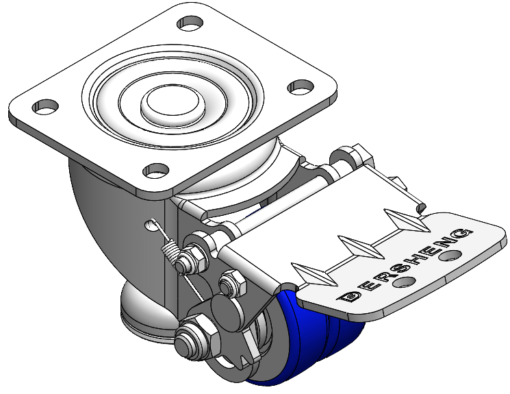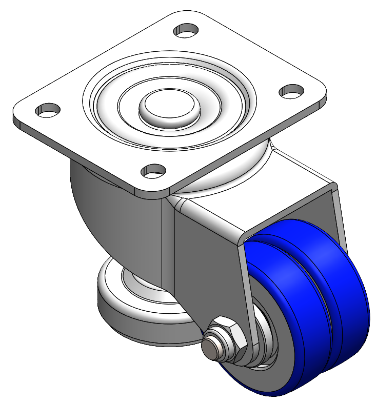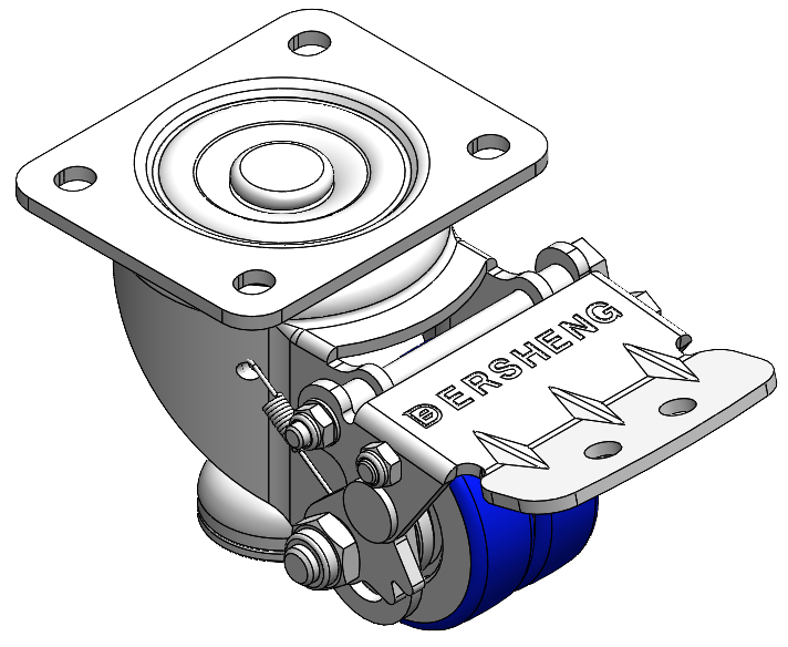 Height Adjustable Leveling Caster. Top Plate with Riveted, Stamping Fork 44.5 x 30mm (1-3/4" x 1-1/8") Bolt Hole Spacing, Long Pedal. Zine-Plated, Top Plate (4T) Mounting Type mechanism with Height Adjustable Stand. Cast Iron Wheel Center with High Quality Polyurethane tread. Blue color, Bearing with Ball Bearing. |