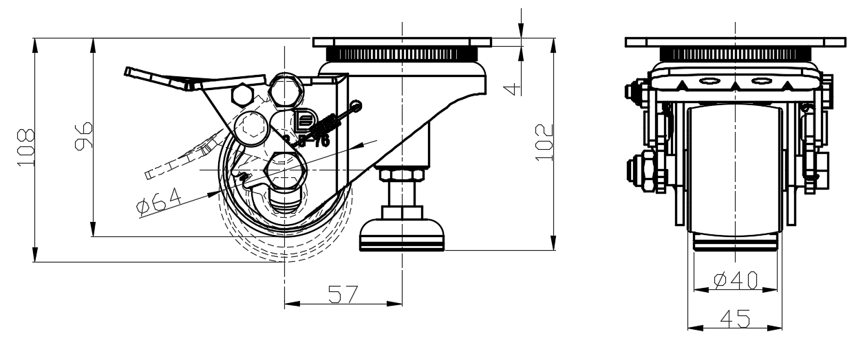 Height Adjustable Leveling Caster. Top Plate Riveted and Stamping with European standard holes, Short Pedal. Zine-Plated, Top Plate (4T) Mounting Type mechanism with adjustable support. Reinforced Polypropylene and tread. Black, Bearing—Ball Bearing. |