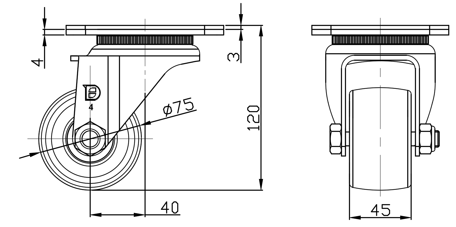 Swivel Caster with Riveted Fork and Stamping Fork—D-shaped hole. Zine-Plated, Fork-mount Mounting Type. Reinforced Polypropylene and tread. Black. Bearing—Ball Bearing. |