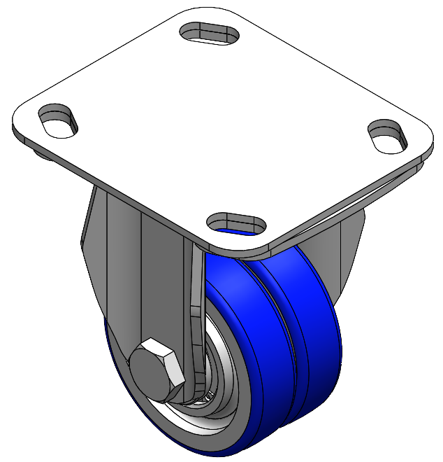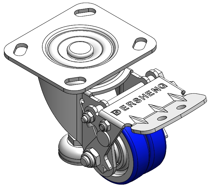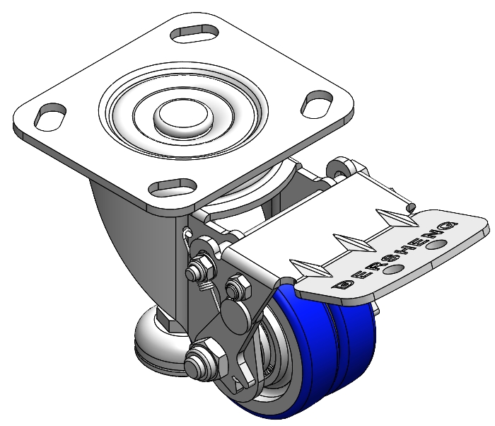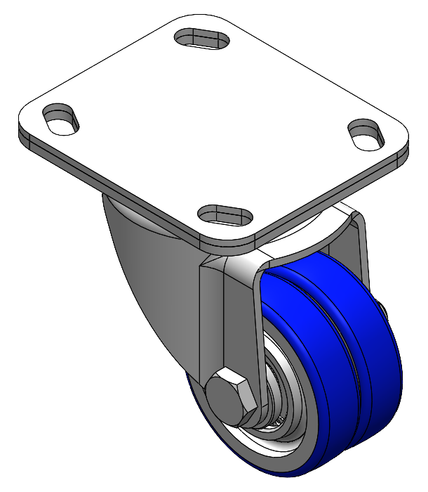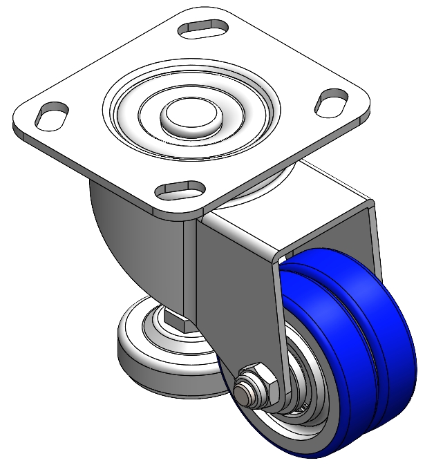 Swivel Caster with Riveted Fork and Stamping Fork with 85 x 70mm (3-3/8" x 2-3/4") Bolt Hole Spacing. Zine-Plated, Mounting Type - Top Plate. Cast Iron Wheel Center with High Quality Polyurethane tread. Blue color. Bearing: Ball Bearing. |