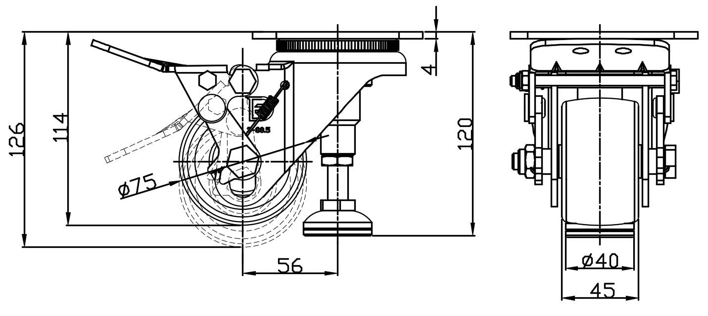 Adjustable lift Caster with Riveted, Stamping Fork 85 x 70mm (3-3/8" x 2-3/4") Bolt Hole Spacing and Long Pedal. Zine-Plated, Mounting Type - Top Plate, and adjustable support. Reinforced Polypropylene and tread. Black, Bearing with Ball Bearing. |