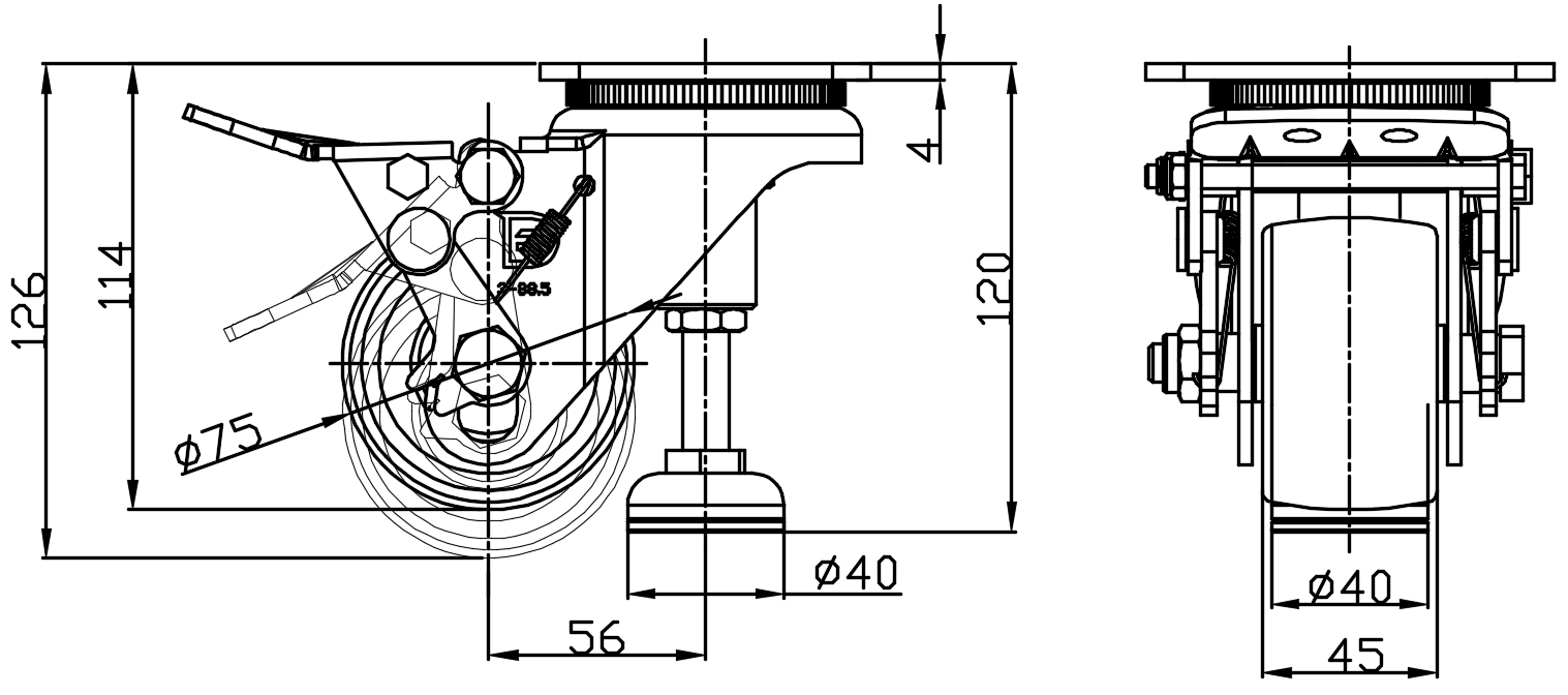 Height Adjustable Leveling Caster, Top Plate with Riveted, Fork and European standard holes, Short Pedal Zine-Plated, Mounting Type - Top Plate, Height Adjustable Stand Reinforced Polypropylene and tread Black, Bearing with Ball Bearing. |
