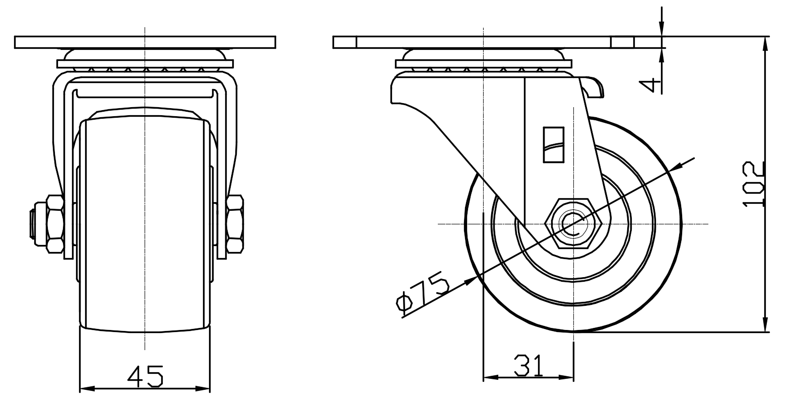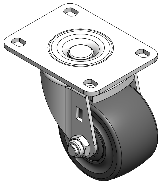 | 活動式腳輪,底板鉚合沖壓腳架—歐規孔 表面鍍鋅,底板式(4T)安裝裝置 熱可塑性塑膠輪芯、輪面 黑色,輪子軸承—精密滾珠。 |