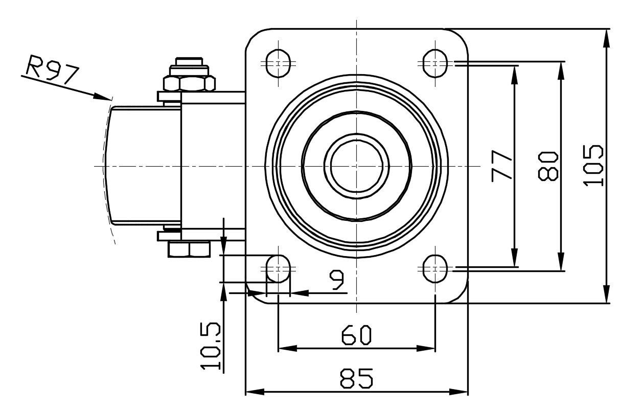 | Bánh xe xoay có đế đinh tán và giá đỡ dập—lỗ tiêu chuẩn Châu Âu
