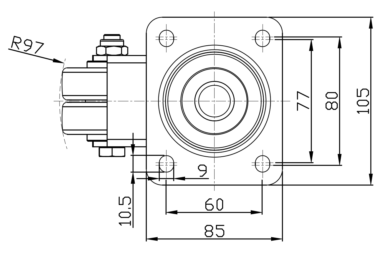 | Bánh xe xoay với đế đinh tán, dập và lỗ tiêu chuẩn Châu Âu.