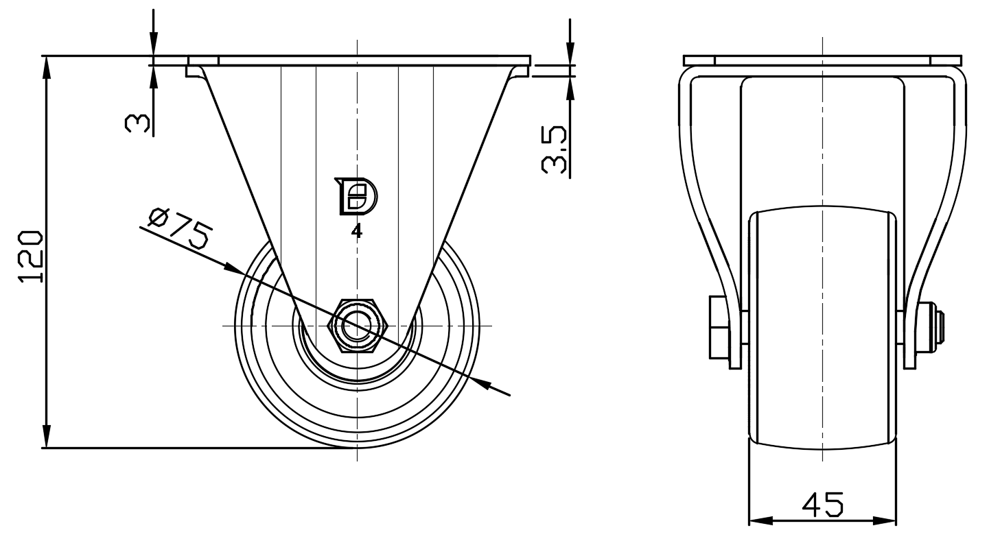 Bánh xe cố định, khung chân dập liền khối - lỗ tiêu chuẩn Châu Âu