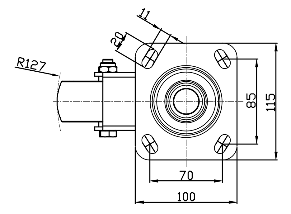 Bánh xe xoay có đế đinh tán và đế dập có lỗ hình chữ D.