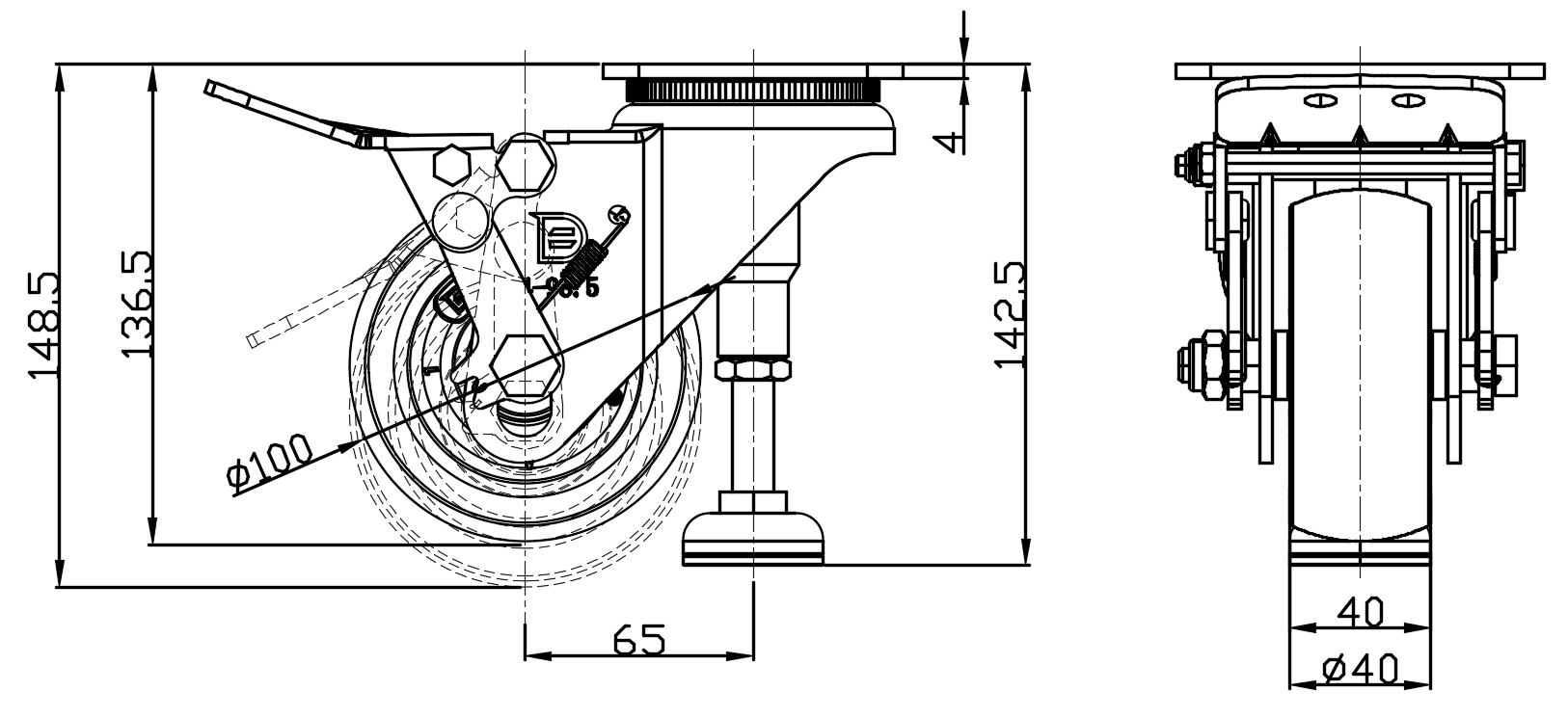 Hoàn thiện mạ kẽm, lắp đế, đế đỡ có thể điều chỉnh Lõi bánh xe bằng nhôm, gai polyurethane chất lượng cao Bạc đạn bánh xe màu nâu—bạc đạn bi chính xác. |