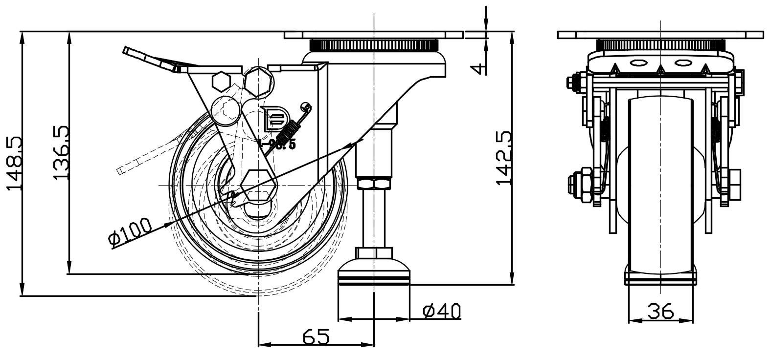 Bánh xe nâng có thể điều chỉnh được với đế đinh tán, dập và lỗ chữ D, bàn đạp ngắn.