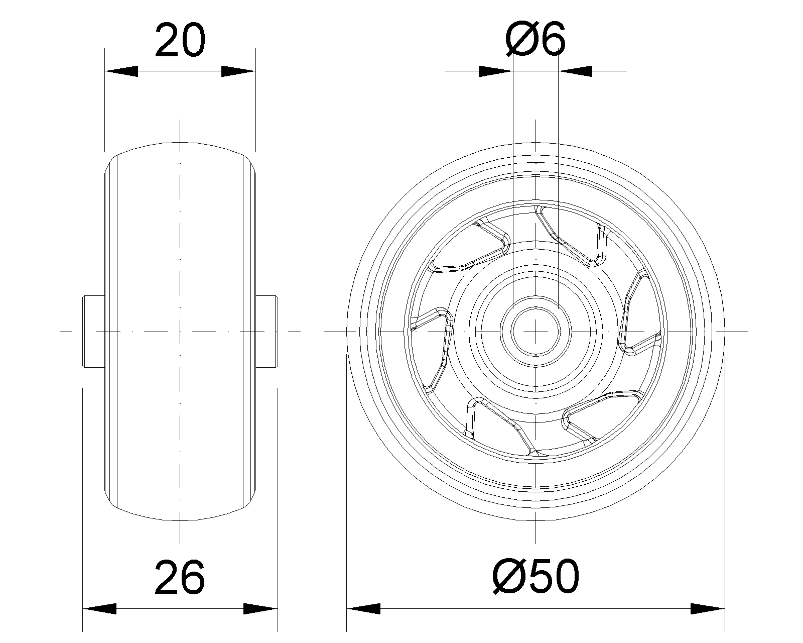Axle Bore(d) 6mm Axle Bore(S) — Bearing Bore Depth(t) — Hub Lenth(T1) 26mm Hardness Of Tread 72±5° Shore A Load Capacity (Dynamic) 56kgs |