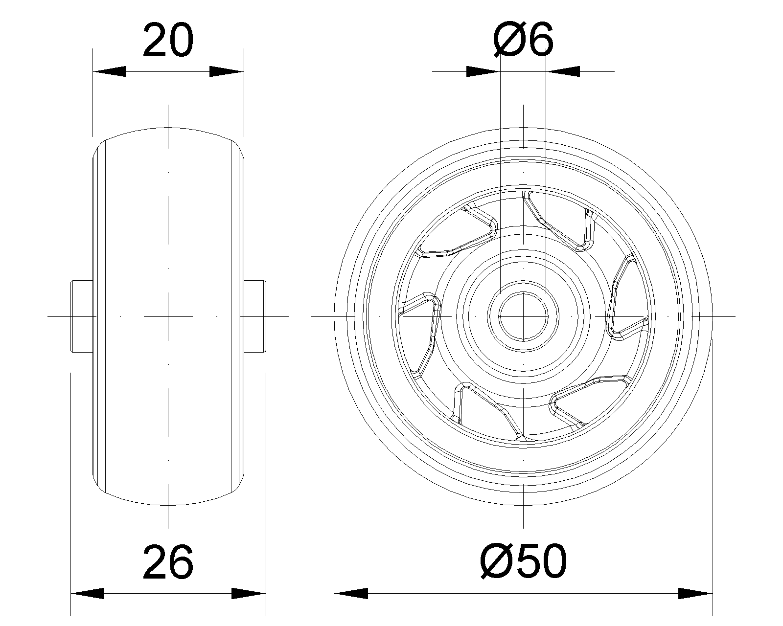 公制 英制 輪徑(D) 50mm 輪寬(T2) 20mm |