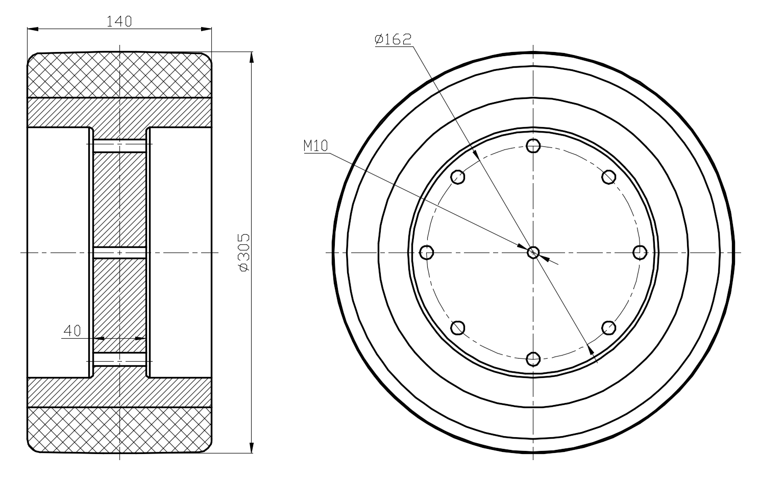 公制 英制 轮子直径(D) 305mm 轮子宽度(T2) 140mm |