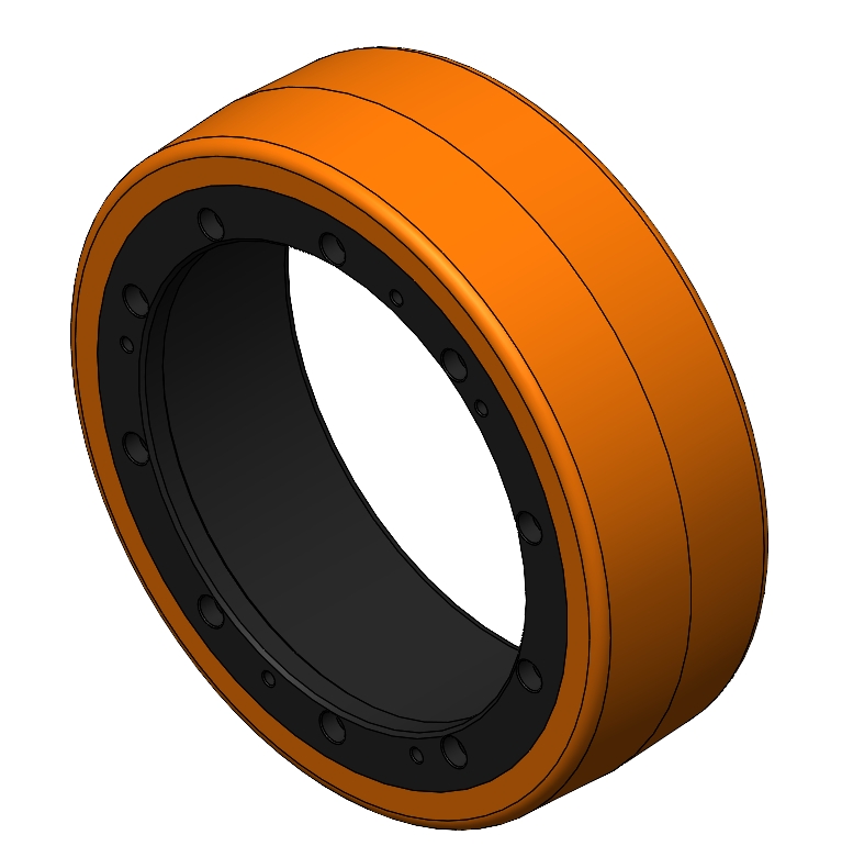 Đặc tính cơ học và khả năng chống mài mòn tuyệt vời Khả năng chống hóa chất và ăn mòn tuyệt vời Thích hợp sử dụng cho xe nâng, xe xếp hàng điện, xe tự hành AGV và máy chà sàn HPU, màu vàng cam, bề mặt bánh xe cong |