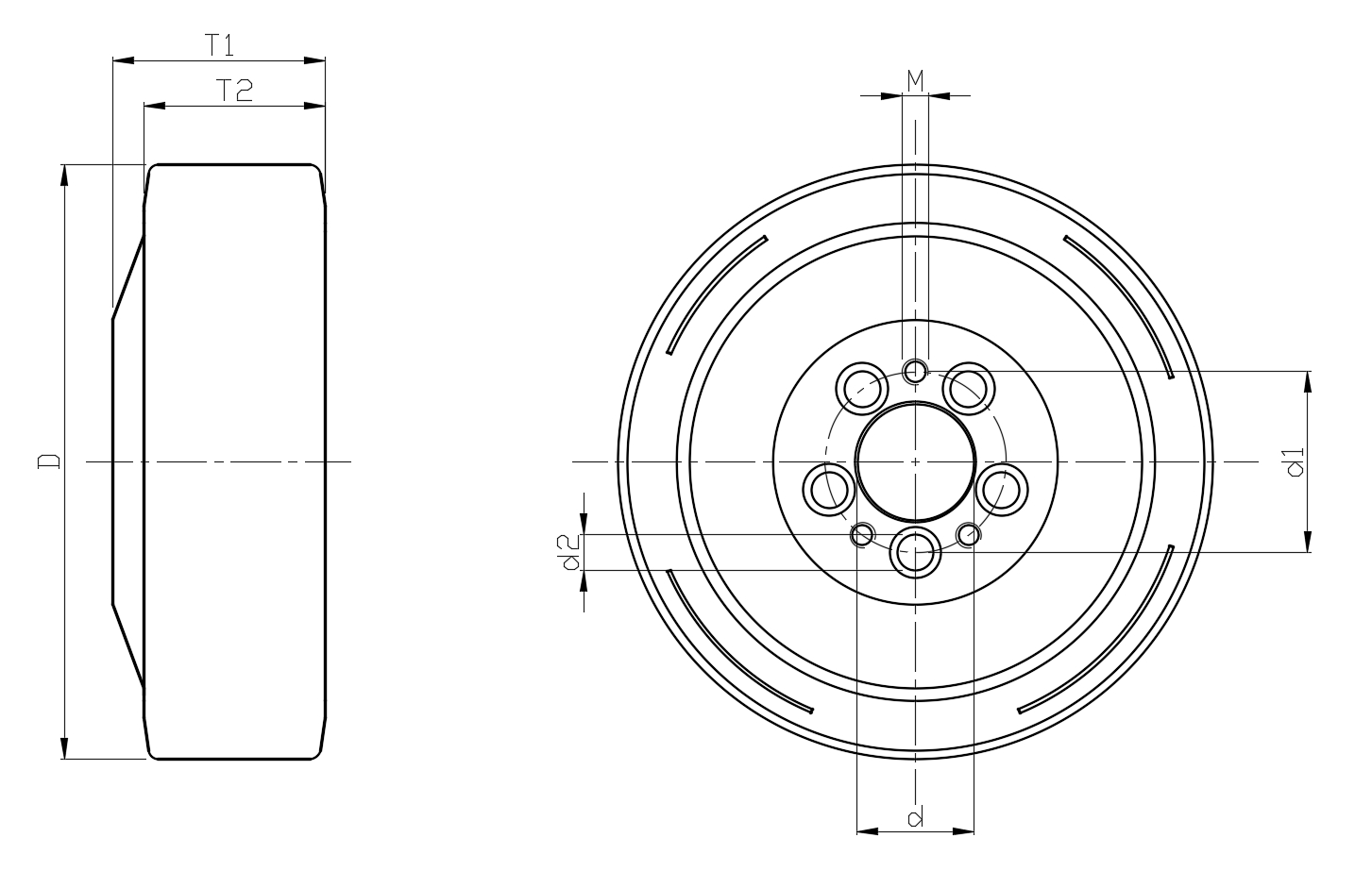 轮子安装中宽(T1) 82mm 轮子安装中孔直径 (d) 45mm 轮子安装固定孔直径(d2) 14mm 轮子安装固定孔PCD(d1) 70mm 轮子安装固定孔数量 5 轮子安装固定螺丝孔(M) 10 轮子安装固定螺丝孔数量 3 荷重(静态) 2250kgs 4Km/h时速的负载能力 1500kgs 6Km/h时速的负载能力 1275kgs 10Km/h时速的负载能力 1050kgs 16Km/h时速的负载能力 600kgs 轮面硬度 92±5° Shore A 温度 -20°C to +70°C 胎面纹路 — |