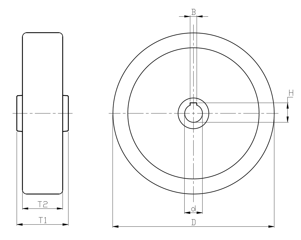 轮子安装中宽(T1) 60mm 轮子安装孔径 (d) 40mm 轮子安装键槽宽度 (B) 12mm 轮子安装键槽深度 (H) 43.3mm 荷重(静态) 1500kgs 4Km/h时速的负载能力 100kgs 6Km/h时速的负载能力 850kgs 10Km/h时速的负载能力 700kgs 16Km/h时速的负载能力 400kgs 轮面硬度 92±5° Shore A 温度 -20°C to +70°C 胎面纹路 — |