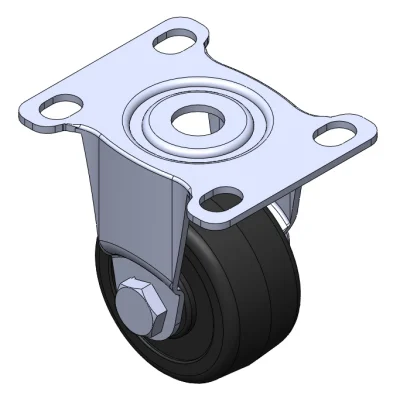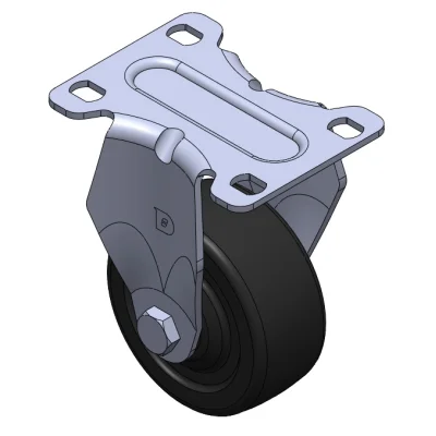 固定式脚轮,一体成型冲压脚架 表面振动,底板式安装装置 热可塑性塑料轮芯、轮面 黑色,轮子—中管式。