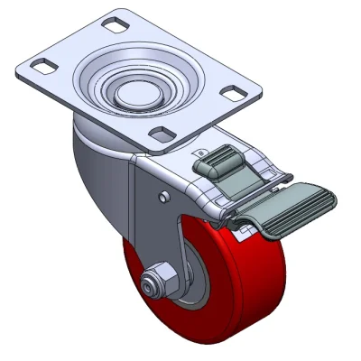 配有雙煞式,鎖定系統的腳輪。底板鉚合沖壓腳架—高級孔 表面振動,底板式安裝裝置(鋅鋁合金踏板) 鑄鐵製輪芯,高品質聚氨酯輪面 紅色,輪子軸承—精密滾珠。