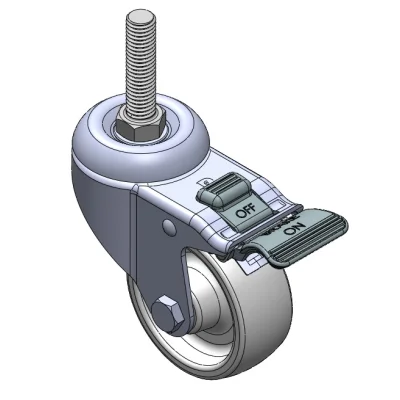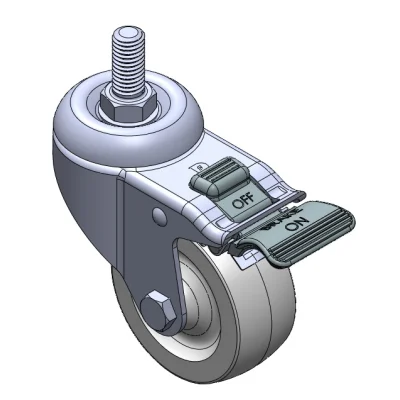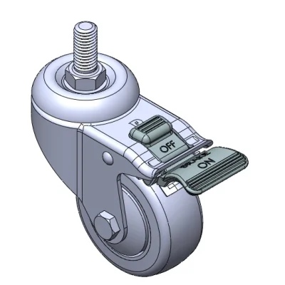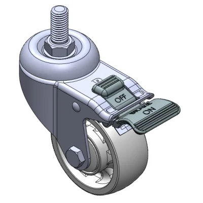 配有雙煞式,鎖定系統的腳輪。牙心鉚合沖壓腳架—1/2"-12牙 表面振動,絲扣式安裝裝置(鋅鋁合金踏板) 耐衝擊聚丙烯輪芯,熱塑性彈性体(TPR)輪面 灰色,輪子軸承—精密滾珠。